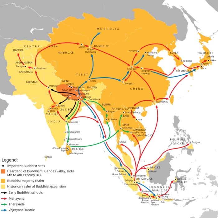 The Silk Road transmission of Buddhism: Mahayana Buddhism first entered the Chinese Empire (Han dynasty) during the Kushan Era. The overland and maritime “Silk Roads” were interlinked and complementary, forming what scholars have called the “great circle of Buddhism”. Source: Wikimedia Commonsꜛ (license: CC BY-SA 3.0)
