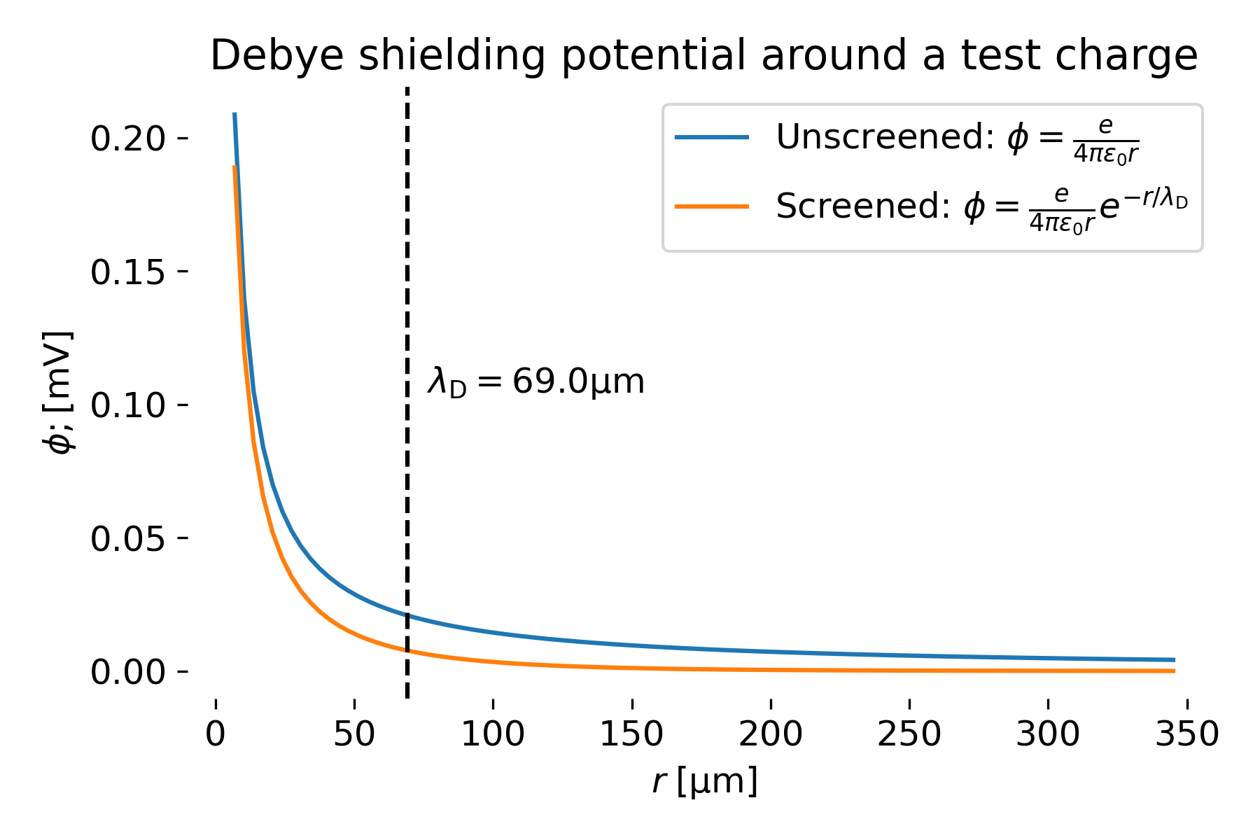 \[\begin{align} \phi(r) = \frac{q}{4 \pi \epsilon_0} \frac{1}{r} e^{-r/\lambda_D}. \end{align}\]Compared to the Coulomb potential in vacuum, the field is exponentially suppressed beyond distances of order $\lambda_D$. For $r \ll \lambda_D$, the potential is essentially Coulombic. For $r \gg \lambda_D$, it is strongly attenuated.