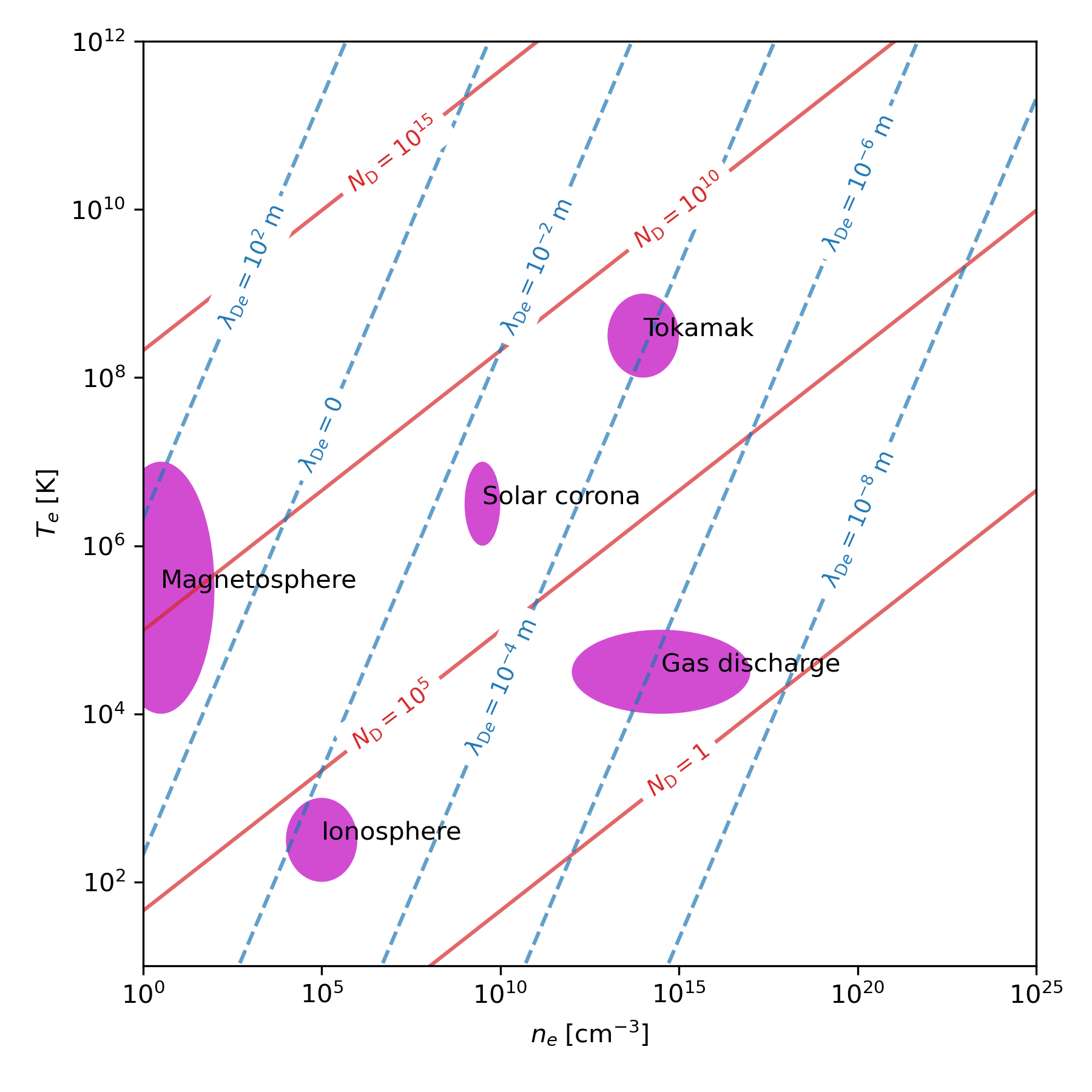 Phase-space overview of plasma regimes in terms of electron density $n_e$ and electron temperature $T_e$. The diagram shows lines of constant Debye length $\lambda_D$ (blue, dashed) and constant number of particles in a Debye sphere $N_D$ (red). Shaded regions indicate typical parameter ranges for different plasma environments, including the magnetosphere, ionosphere, solar corona, gas discharges, and so-called tokamak plasmas. The plot illustrates how plasma classification is governed by collective effects. A system behaves as a plasma only when many particles reside within a Debye sphere ($N_D \gg 1$) and electrostatic interactions are screened on scales larger than $\lambda_D$.