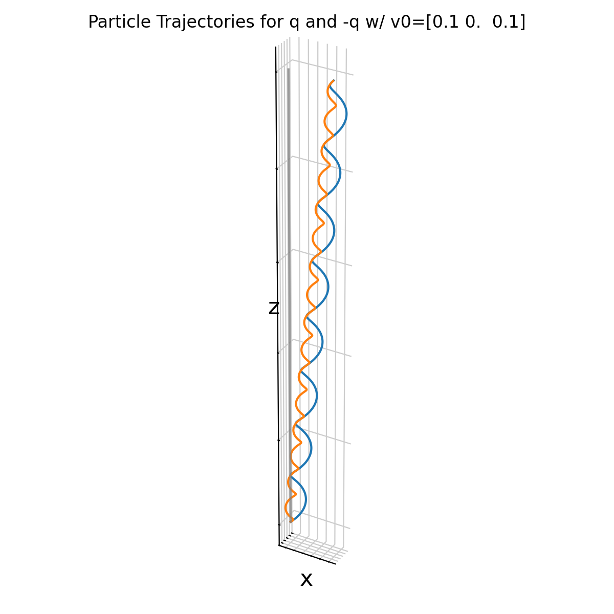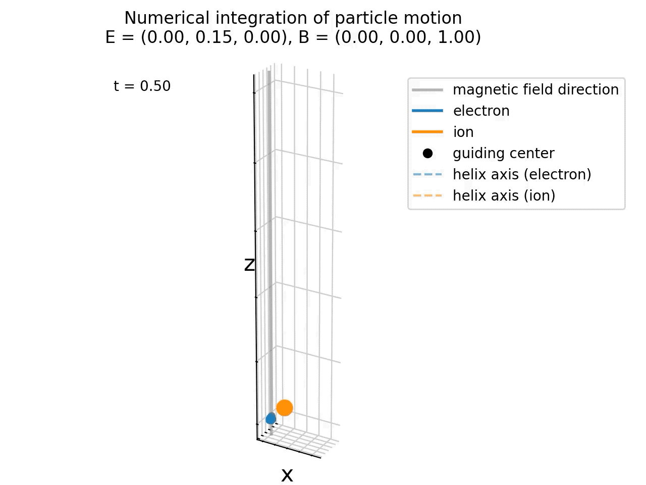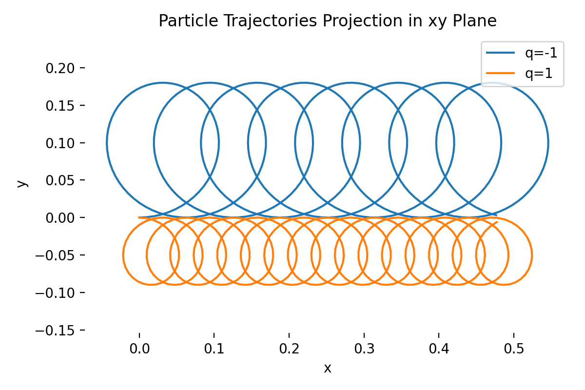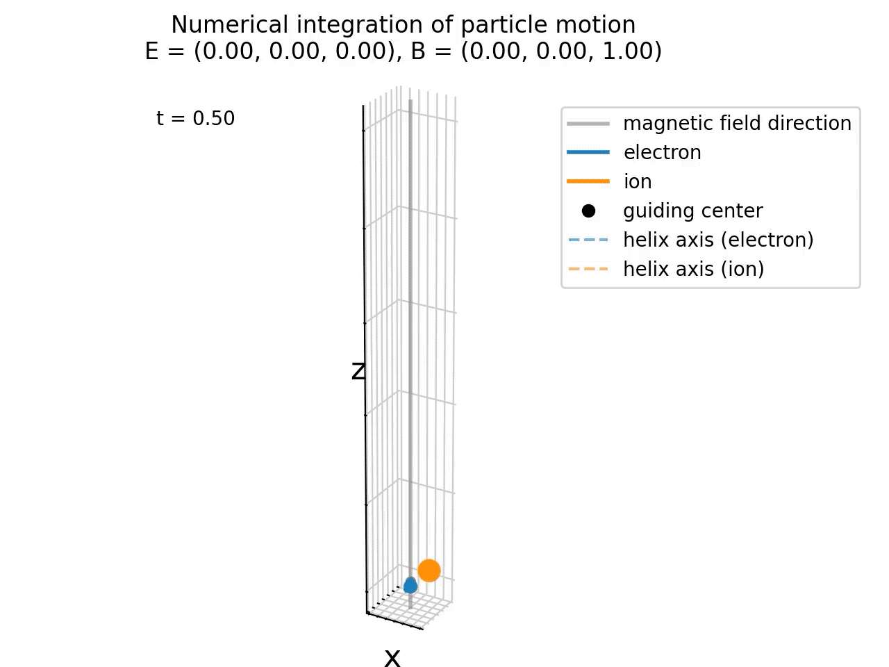 In our above simulation, we hade no electric field present (E=0), so there was no E×B drift, so that the guiding center and helix axis of both particles overlap and remain at the origin in the xy plane. The particles’ motion is purely helical around the magnetic field lines and consists of two components: