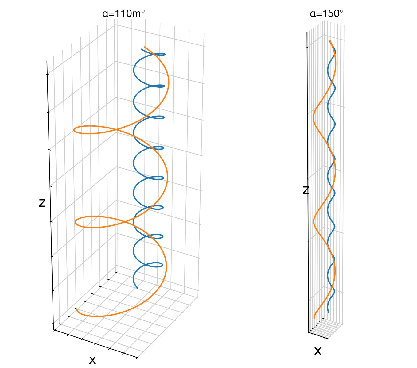 Numerical simulation of charged-particles in a uniform magnetic field $\mathbf{B}$. The particles gyrate around magnetic field lines. Here, an electron (blue) and a positively charged ion (orange) are shown for a pitch angle of 75°.