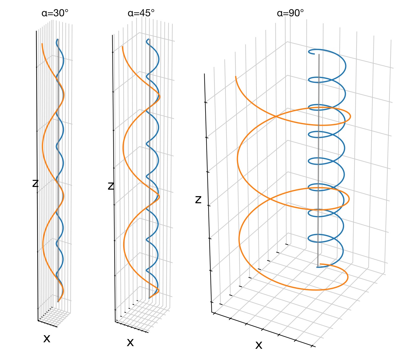 Examples of particle trajectories for different pitch angles (30°, 45°, and 75°) in the absence of an electric field. As the pitch angle increases, the particles exhibit more pronounced gyration around the magnetic field lines, while the parallel motion along the field lines decreases (the latter is hardly visible in these plots as we haven’t scalled the z-axis equally).