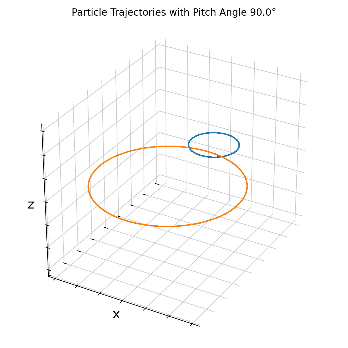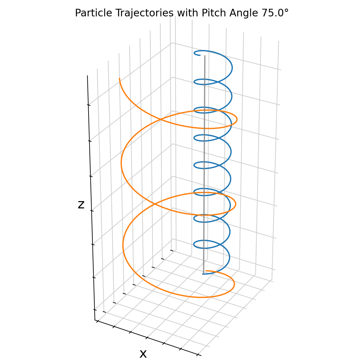 By parametrizing the initial velocity through the pitch angle, the geometric meaning of helical motion becomes explicit. Large pitch angles correspond to tightly wound helices with small parallel displacement, while small pitch angles produce shallow helices that propagate rapidly along magnetic field lines. This becomes even more obvious when we set the pitch angle to 90° (purely perpendicular initial velocity):