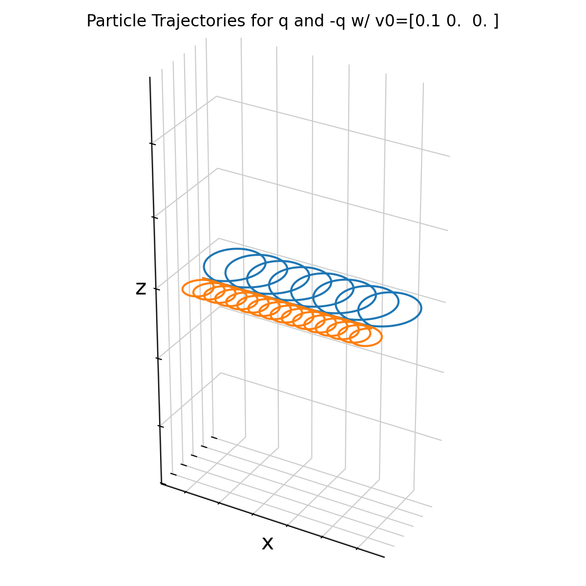 You can try different values of the electric field,e.g., E=(0,0.15,0), in the code above to see how the trajectories change: