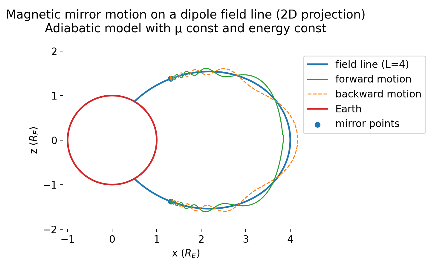 The plot shows the numerically simulated magnetic mirror motion of a positively charged particle on a dipole magnetic field line in a 2D meridional projection. The blue curve represents a single dipole field line labeled by $L=4$. The particle’s guiding center moves along this field line while executing a fast gyromotion, visualized as a small in-plane oscillation around the guiding center. As the particle propagates toward higher magnetic latitude, the magnetic field strength increases and conservation of the first adiabatic invariant $\mu$ forces an increase in perpendicular velocity at the expense of the parallel component. At the mirror points (blue markers), the parallel velocity vanishes and the particle reverses direction, producing a periodic bounce motion between conjugate hemispheres. Forward and backward segments of the bounce motion are shown separately. The Earth is drawn for scale. Slow azimuthal drift is not included in this 2D projection.