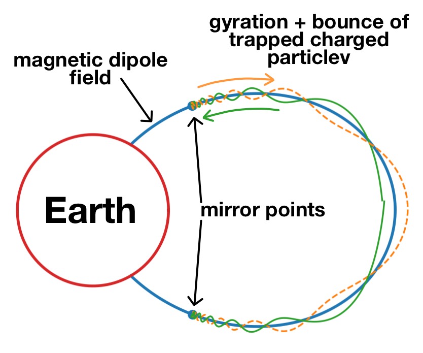 - Bounce motion: particles move along $\mathbf{B}$, reflect at mirror points, and repeat periodically, implying $J = \text{const.}$ on the bounce time scale.