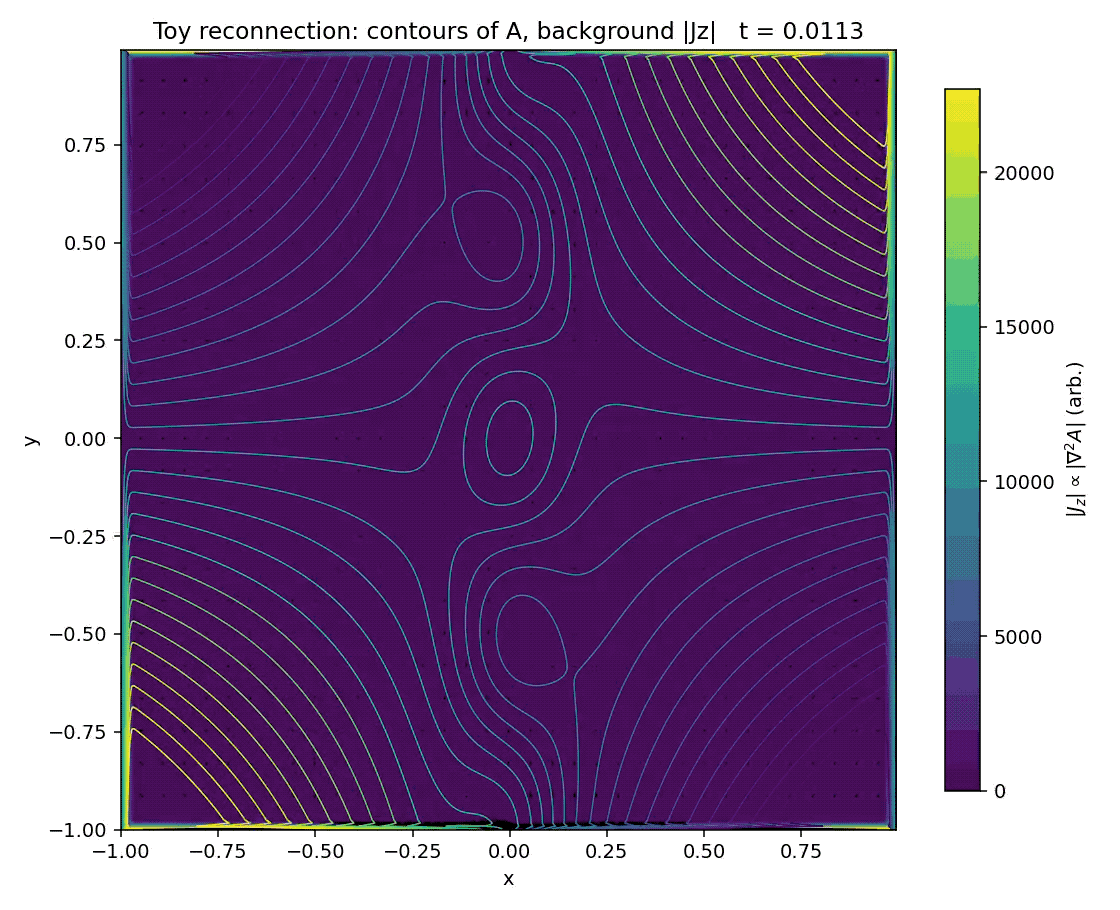 Time evolution of a two-dimensional kinematic reconnection toy model based on X-point collapse. Shown are contours of the magnetic flux function $A(x,y,t)$, representing magnetic field lines, overlaid on the magnitude of the out-of-plane current density proxy $|J_z| \propto |\nabla^2 A|$ (color scale). A prescribed incompressible stagnation-point flow advects the magnetic field toward the X-point, thinning the current layer and enhancing gradients until resistive diffusion becomes effective and magnetic topology changes. The flow is externally imposed and not evolved self-consistently; the model therefore illustrates the geometric and topological aspects of reconnection rather than full magnetohydrodynamic feedback. Initial, intermediate, and final frames are shown, corresponding to progressive X-point collapse and reconnection.
