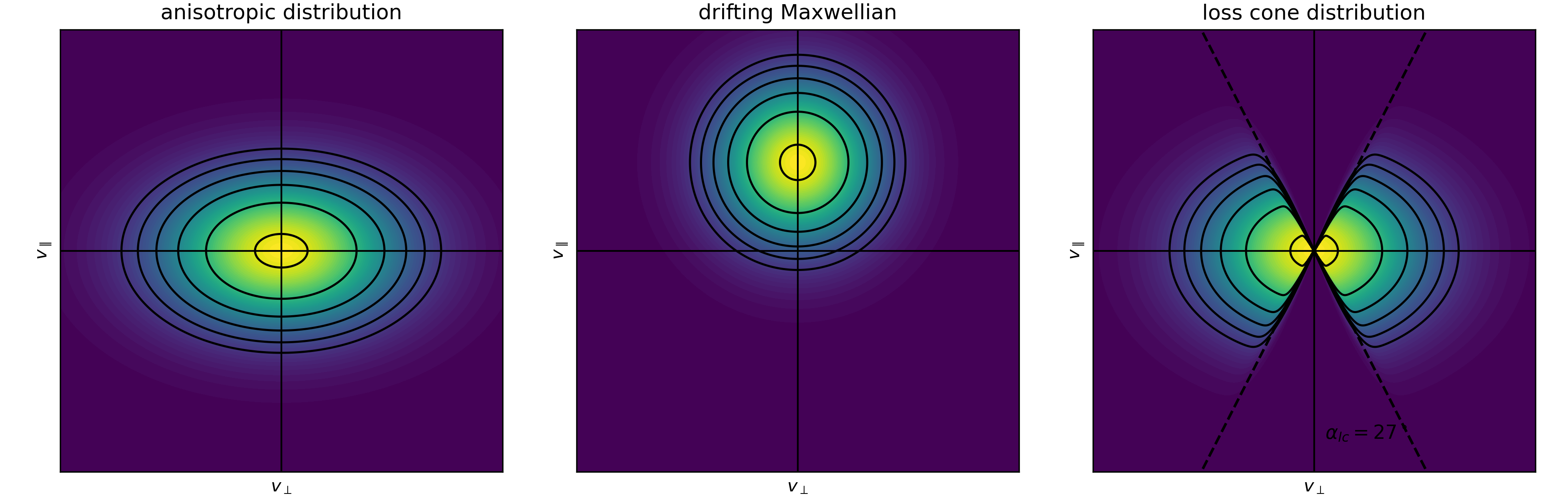 Representative velocity-space distributions in a magnetized plasma, shown in the $(v_\perp, v_\parallel)$ plane. Left: anisotropic bi-Maxwellian with different perpendicular and parallel temperatures $(T_\perp \neq T_\parallel)$, producing elliptical contours. Center: drifting Maxwellian, shifted along the parallel velocity direction by a bulk drift $u_\parallel$. Right: loss-cone distribution, where particles with small pitch angles are depleted due to escape along magnetic field lines; dashed lines indicate the loss-cone boundary $\alpha_{lc}$. Contours denote constant values of the distribution function. The Python code to generate this figure is available in this GitHub repositoryꜛ.