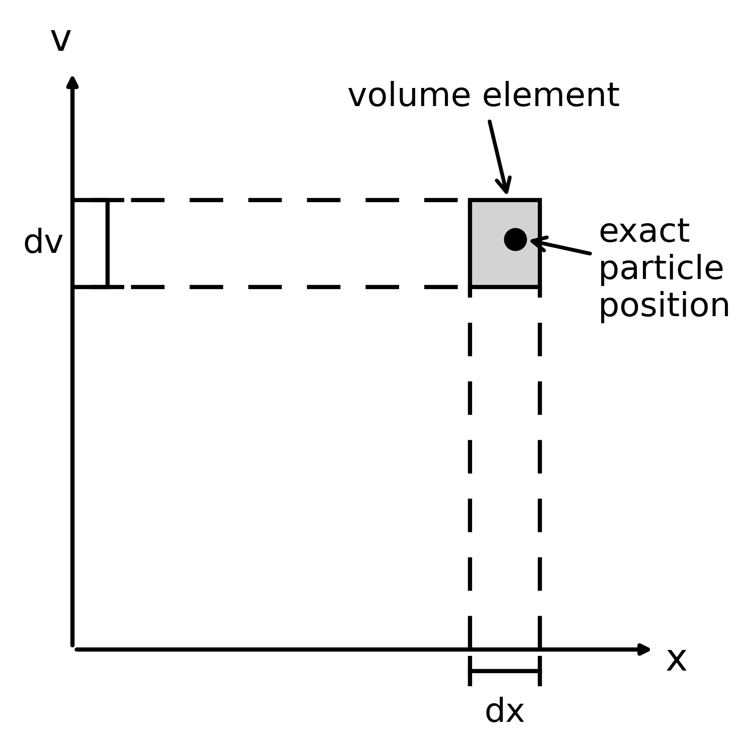 Schematic illustration of phase space in one spatial and one velocity dimension. A particle with exact position $(x,v)$ is represented statistically by a finite phase-space volume element $dx,dv$. The distribution function $f(x,v,t)$ measures the particle density within such elements. In collisionless dynamics governed by the Vlasov equation, phase-space volume is conserved along particle trajectories (Liouville’s theorem): The element may deform as it is advected, but its area remains constant. The Python code to generate this figure is available in this GitHub repositoryꜛ.