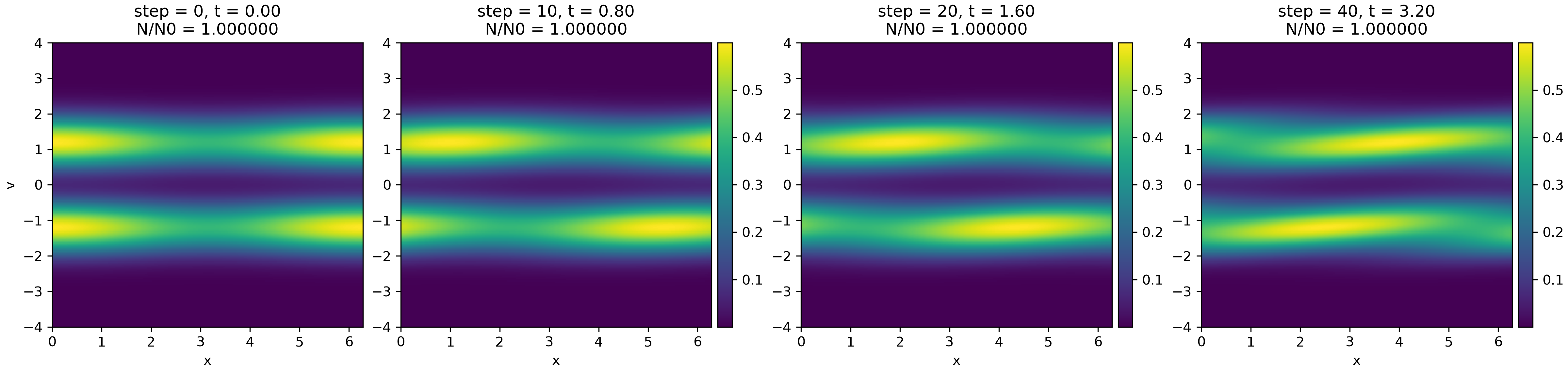 Collisionless Vlasov evolution in one spatial and one velocity dimension. Shown is the phase-space distribution $f(x,v,t)$ for a weakly modulated two-stream initial condition, evolved with a semi-Lagrangian scheme. In the absence of forces and collisions, each velocity slice is advected ballistically in space, leading to phase-space shearing while conserving particle number exactly ($N/N_0=1$). The figure illustrates Liouville’s theorem and the purely advective nature of the Vlasov equation. The Python code to generate this figure is available in this GitHub repositoryꜛ.