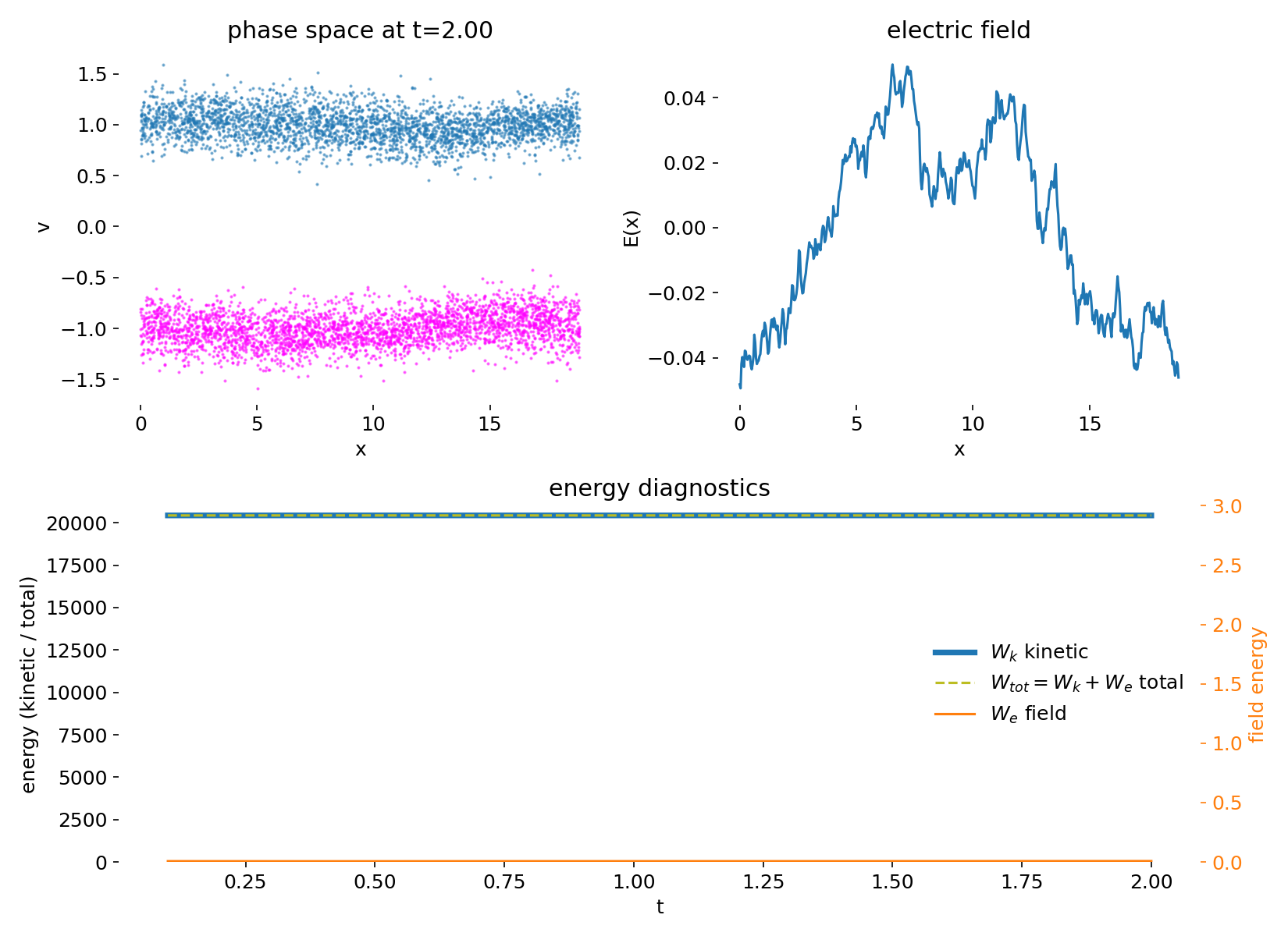 The resulting animation of the two stream instability evolution using the FFT based PIC code. The upper left panel shows the phase space evolution of the two counter streaming electron beams, while the upper right panel displays the electric field. The bottom tracks the kinetic, field, and total energy evolution over time. From the initial linear growth phase to nonlinear saturation and mixing, the simulation captures the key dynamics of the instability.
