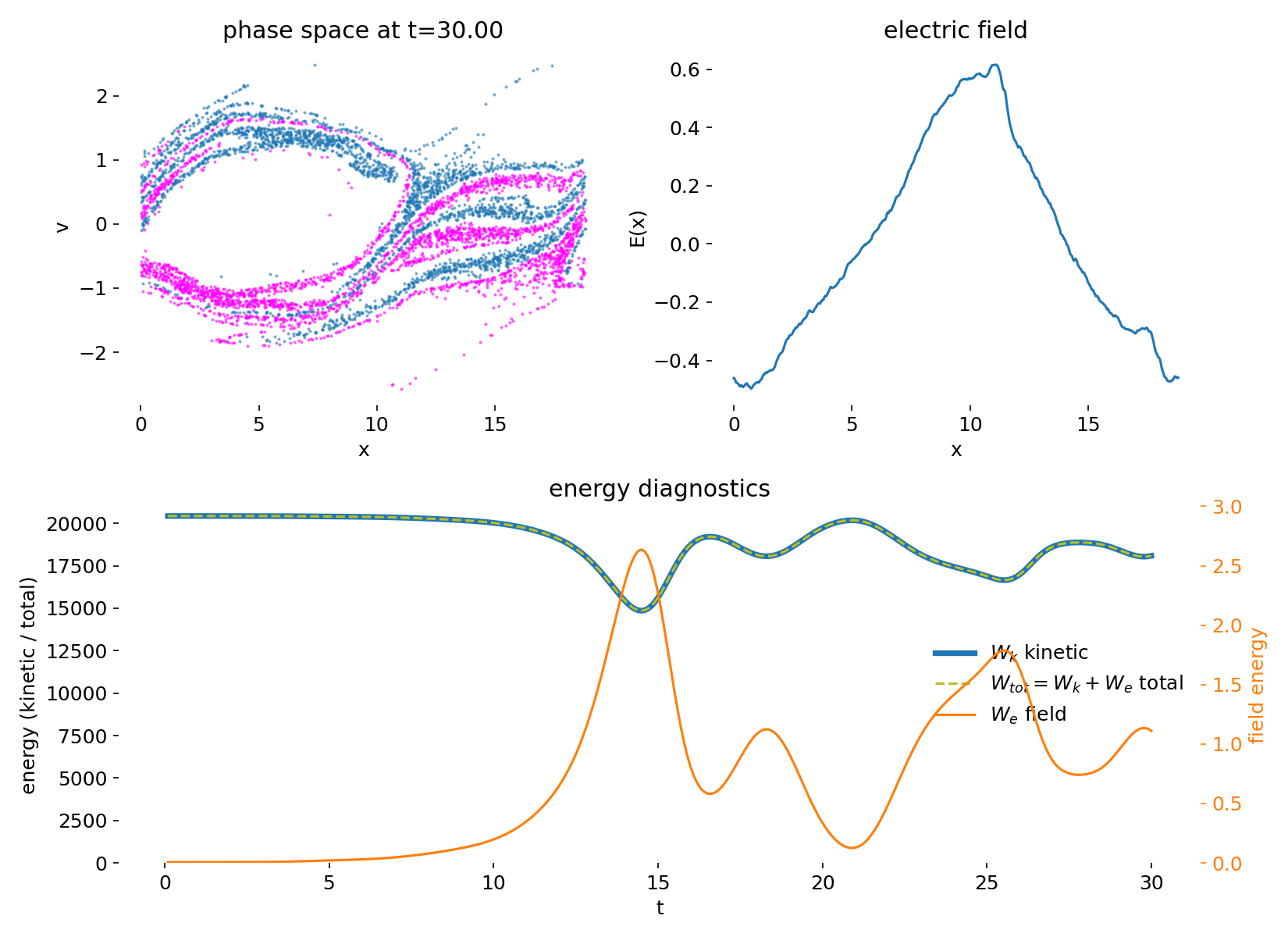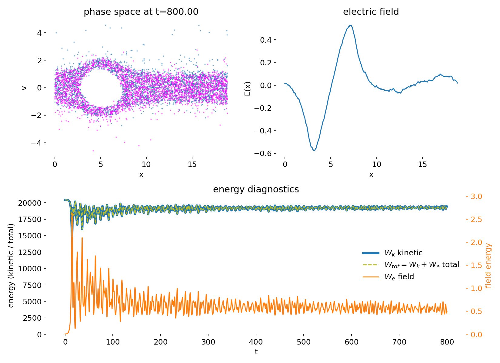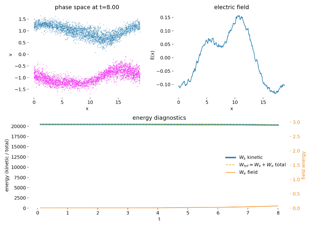 Finally, we run the simulation with specified parameters. The results, including phase space evolution and energy diagnostics, are saved as PNG frames and compiled into a GIF: