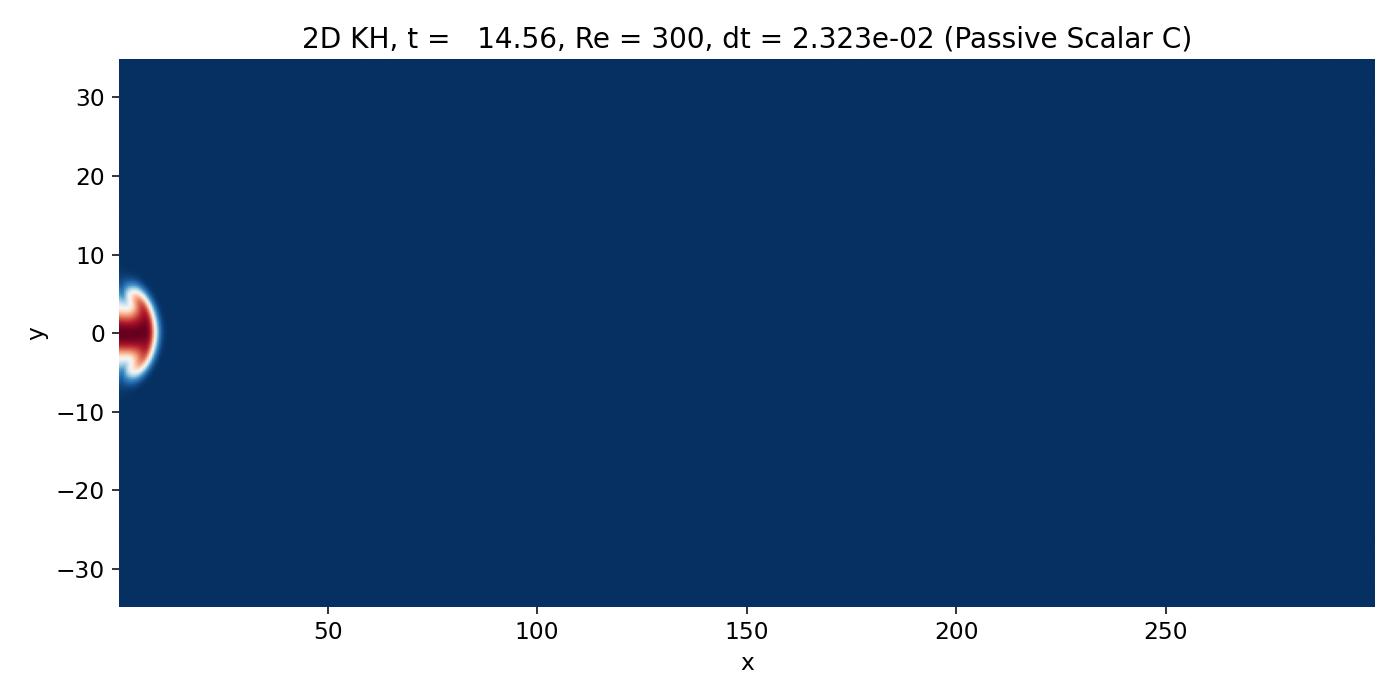 In our code, first order upwind advection is a strong smoothing operator. It suppresses small scale roll up and makes early KH waviness appear softer than it would under a higher order flux reconstruction. This is why early edge billows look comparatively unspecific and become visually compelling only once they reach large amplitude and scale.