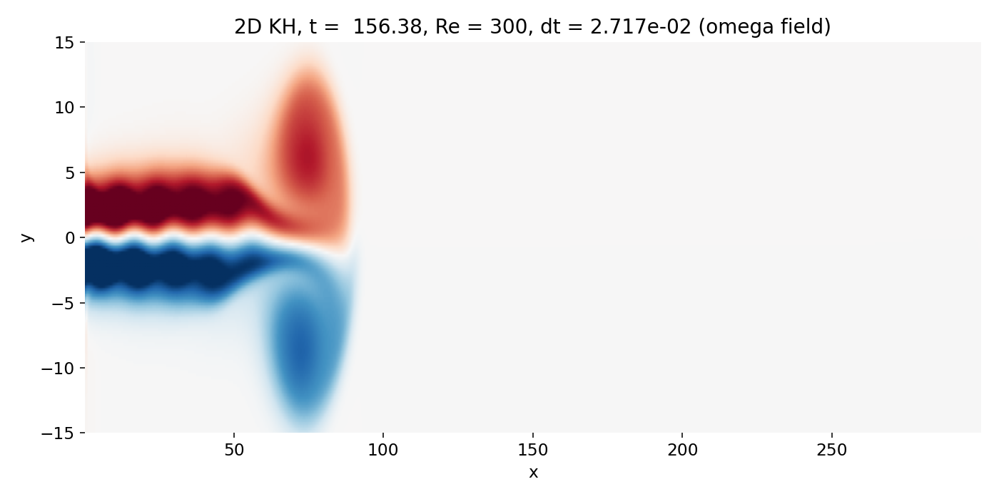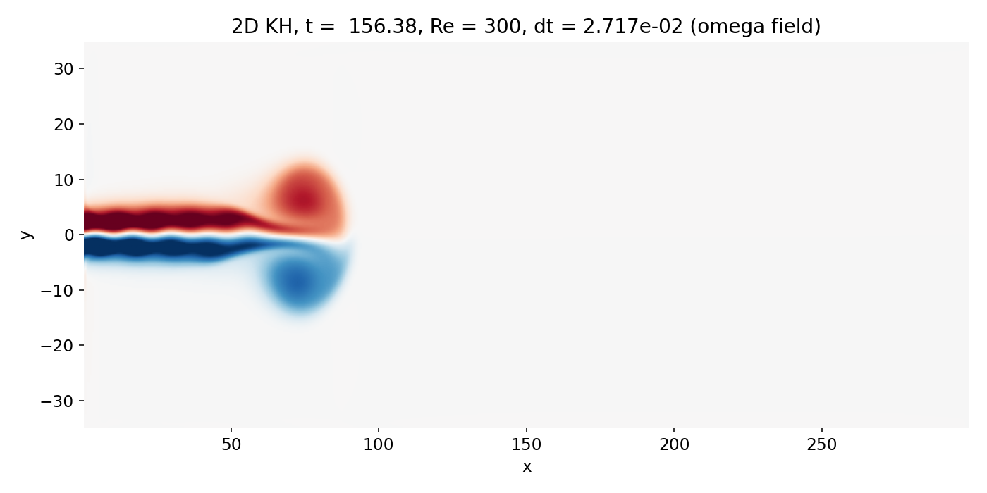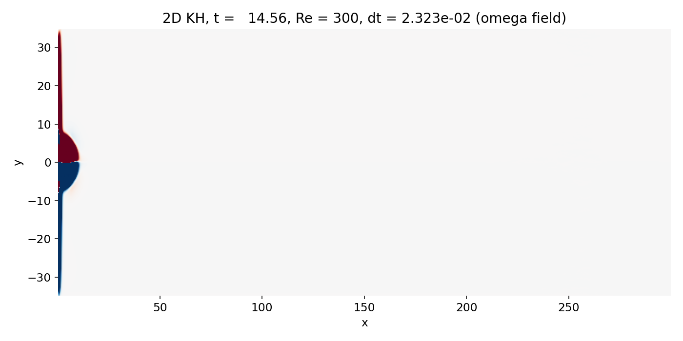 In this post, we explored Kelvin–Helmholtz type dynamics from a complementary numerical and physical perspective by moving from a doubly periodic, pseudospectral vorticity formulation to a finite volume projection method for the incompressible Navier–Stokes equations on a staggered grid with inflow and outflow boundaries. This change in formulation and domain setup is not merely technical. It fundamentally alters how instability growth is interpreted.