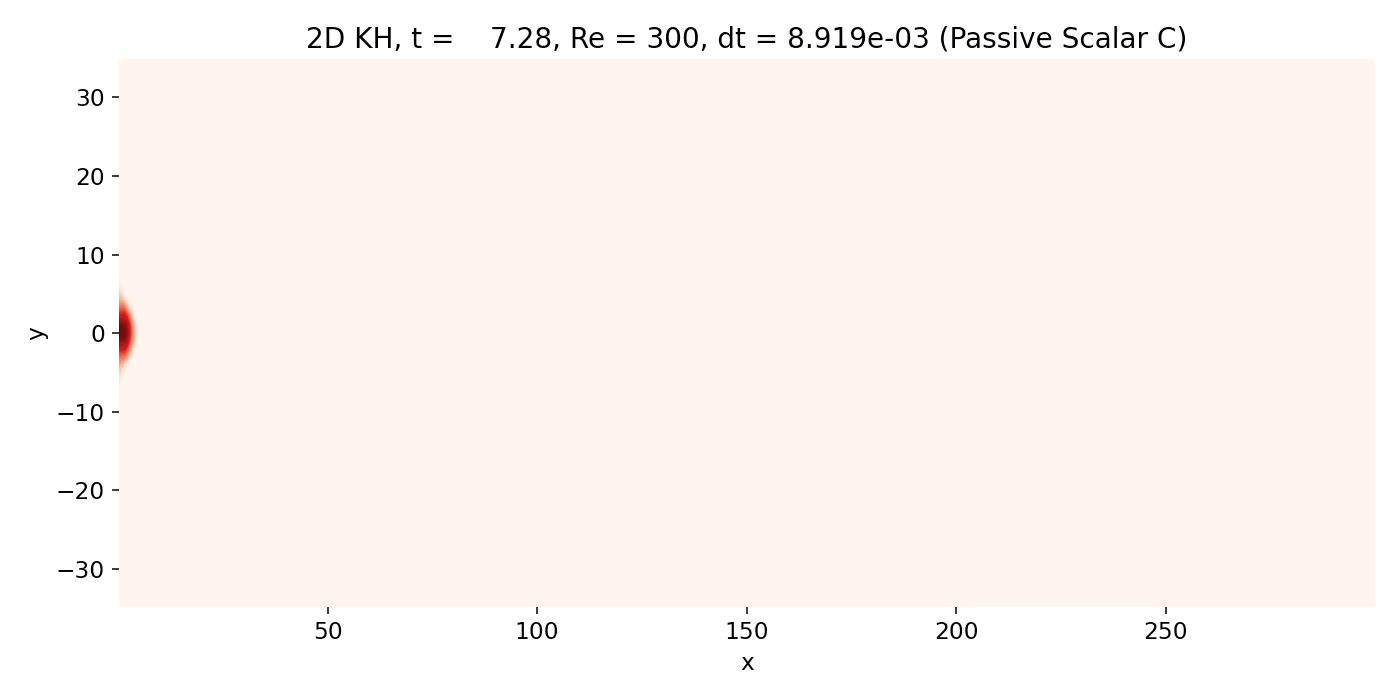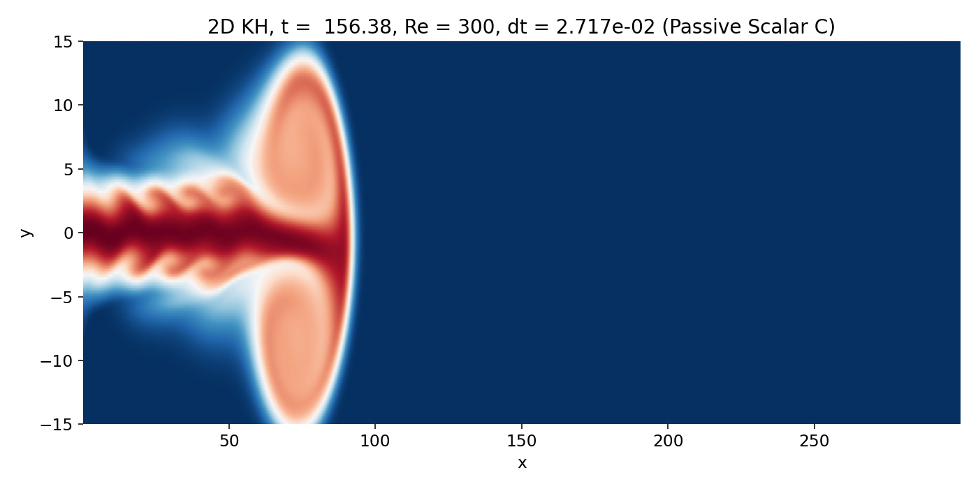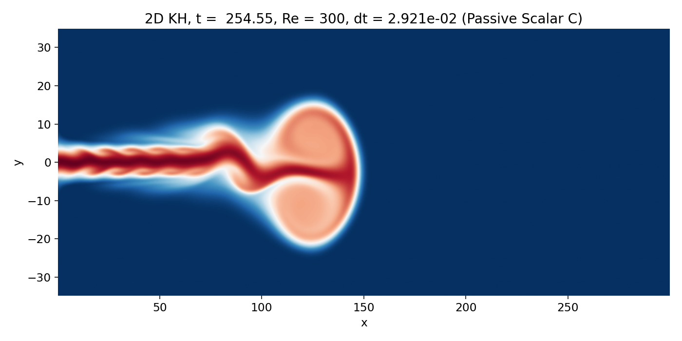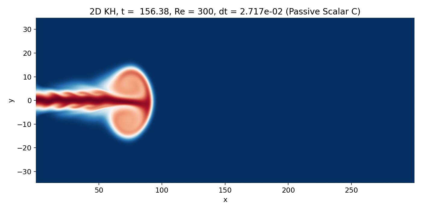 In this post, we explored Kelvin–Helmholtz type dynamics from a complementary numerical and physical perspective by moving from a doubly periodic, pseudospectral vorticity formulation to a finite volume projection method for the incompressible Navier–Stokes equations on a staggered grid with inflow and outflow boundaries. This change in formulation and domain setup is not merely technical. It fundamentally alters how instability growth is interpreted.