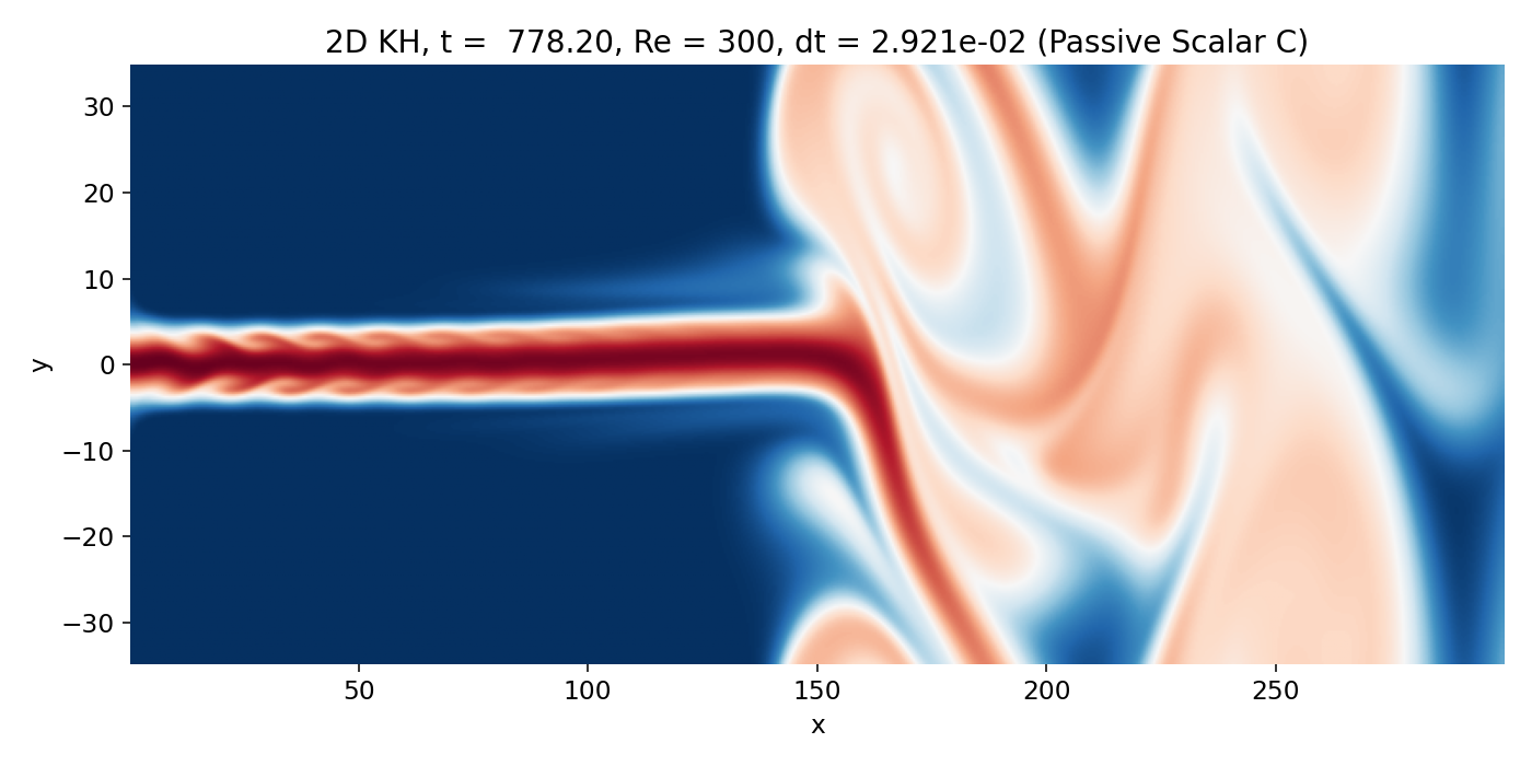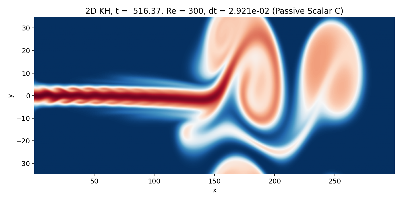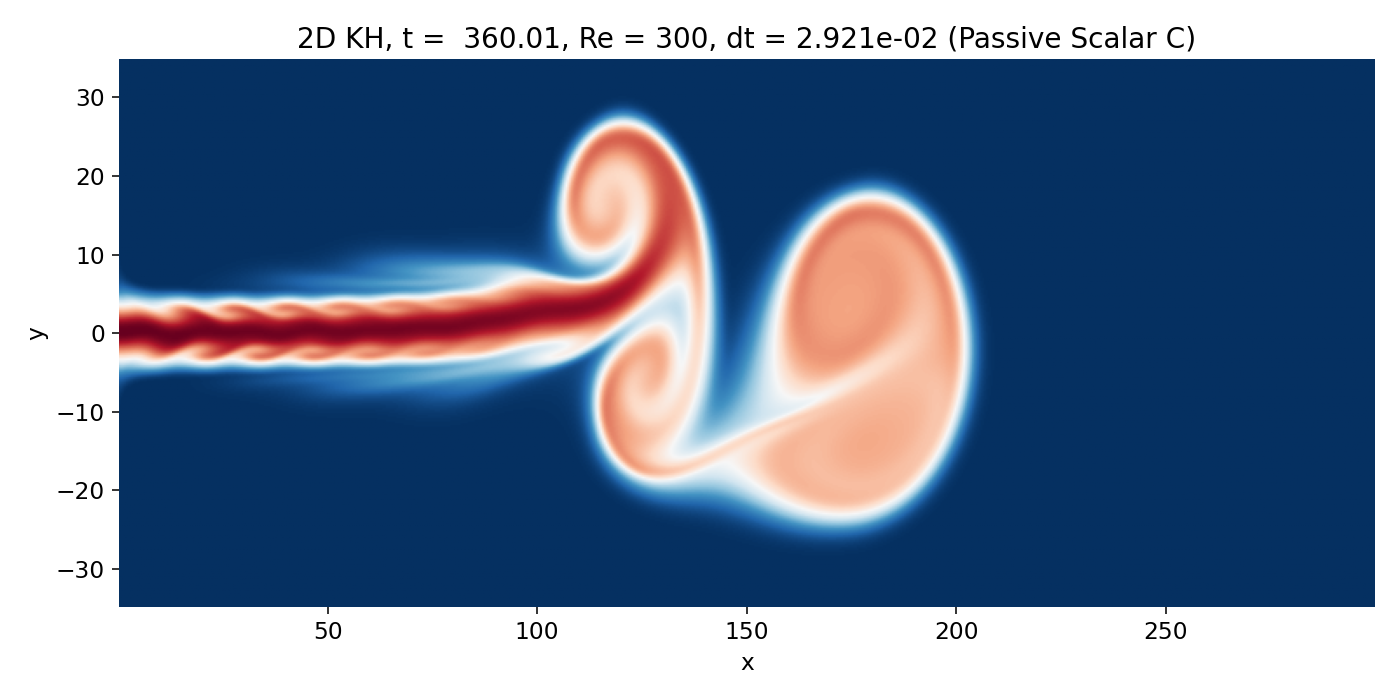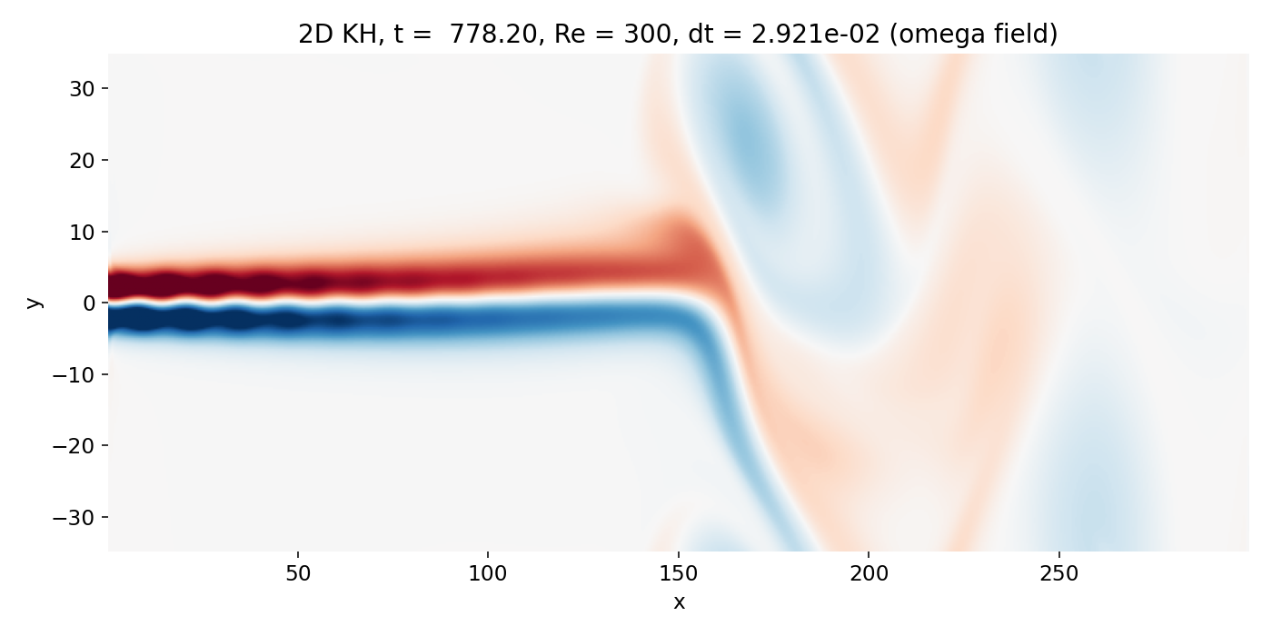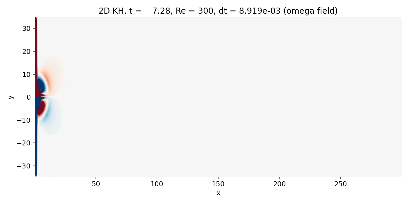 In our previous post we discussed Kelvin-Helmholtz growth in a 2D incompressible shear layer using a vorticity streamfunction formulation on a doubly periodic domain, evolved with a pseudospectral method. Directly building on that, I thought it would be interesting to present an alternative approach that highlights different aspects of both the mathematical formulation and the numerical method.