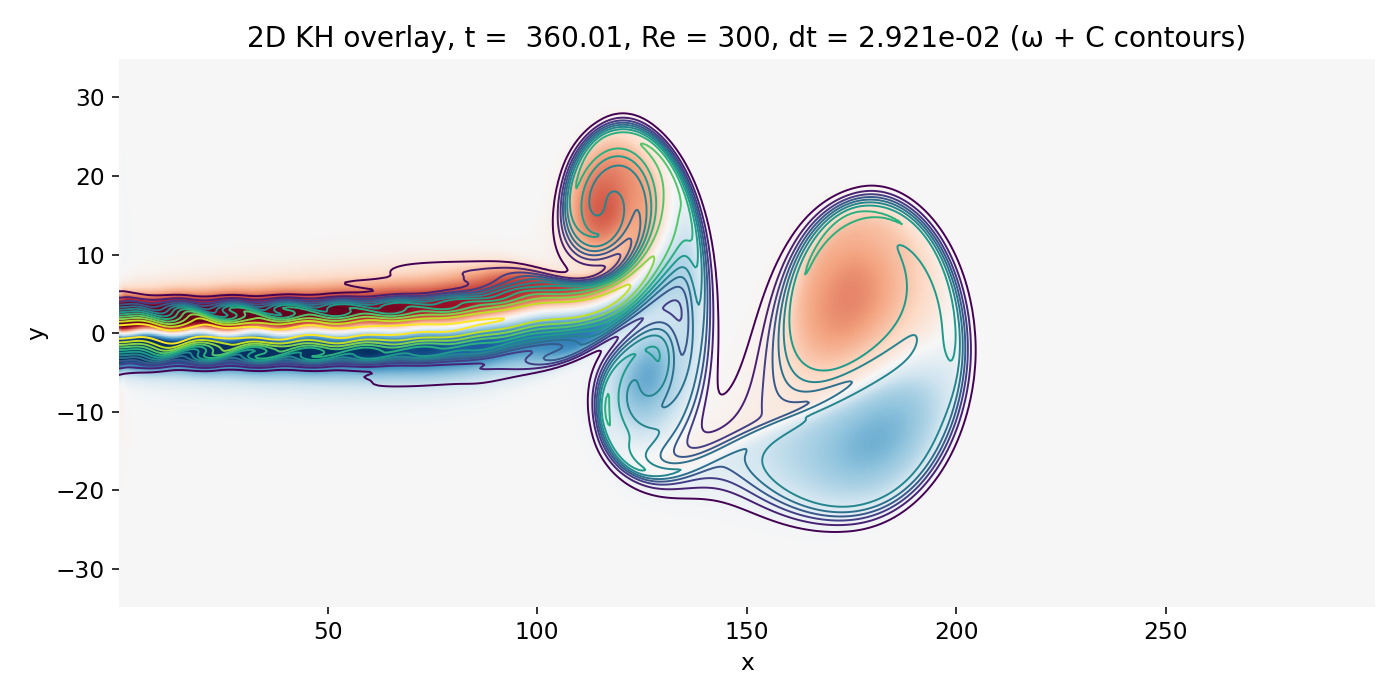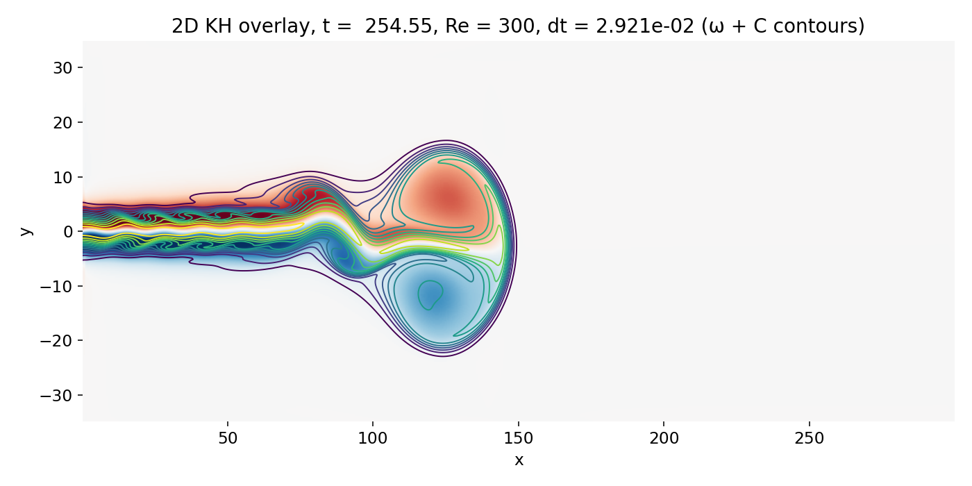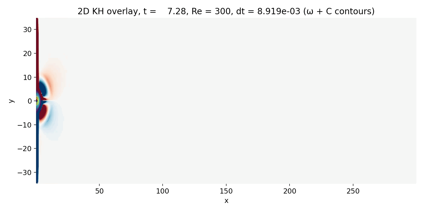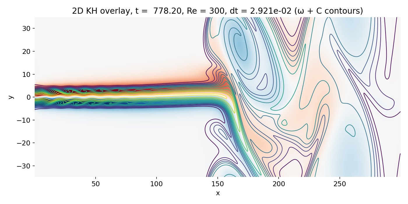A direct plausibility check is already embedded in the overlay: If the structures are KH related, they should sit on the shear layers and the scalar contours should wrap around vorticity concentrations. That is exactly what our plots show, especially once the large scale structures are established.