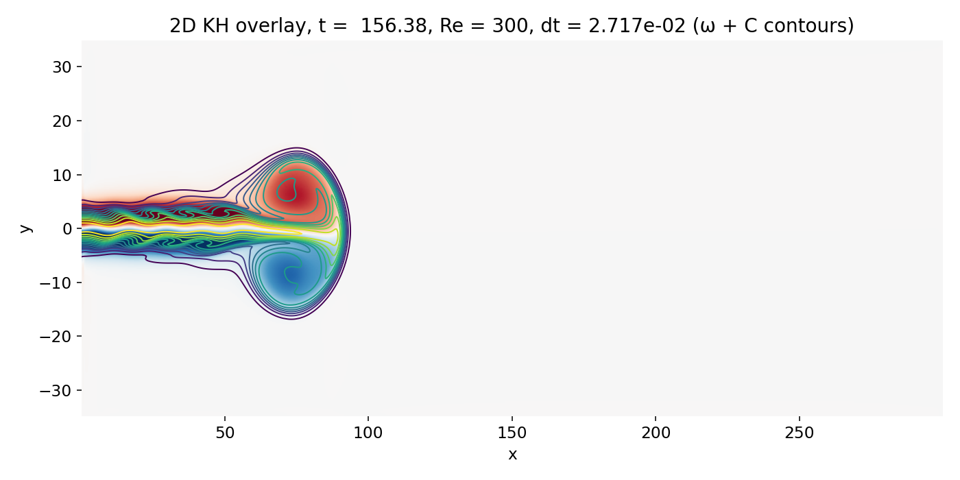 \[\omega \approx -\frac{\partial u}{\partial y}.\]In the overlay frames, the densest $C$ contours align with regions of strong $|\omega|$ along the upper and lower jet boundaries, and later wrap around vortical cores. That is consistent with KH behavior superimposed on a strong starting jet head vortex.