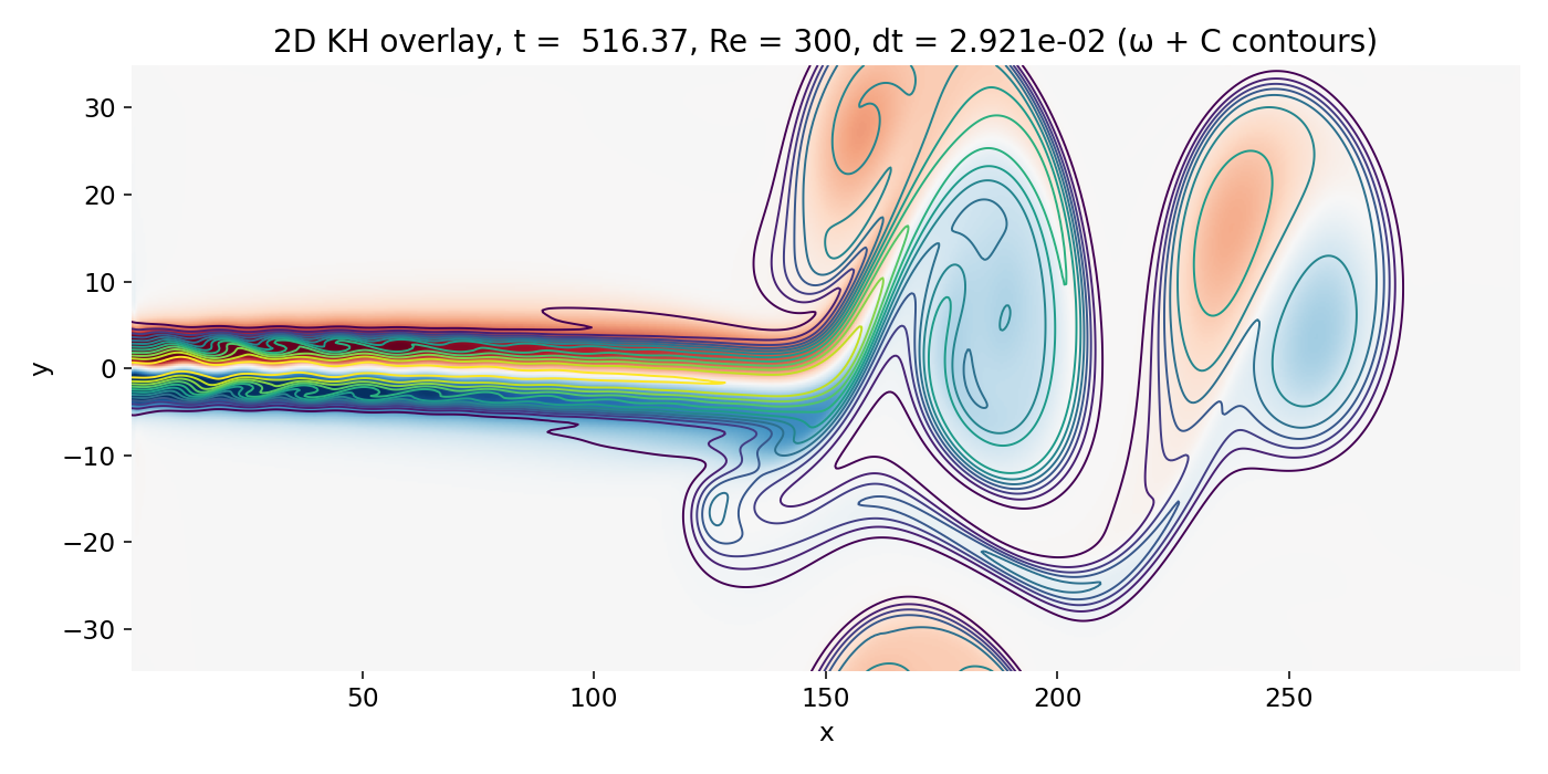 The overlay again clarifies the physics: the scalar contours are not free floating decorations. They cling to the vorticity rich shear layers and then wrap around the large vortices, showing mixing and entrainment driven by rotational flow. This is the correct “KH consistency check” without adding extra diagnostics: billows in $C$ align with maxima of $|\omega|$ along the jet boundaries.