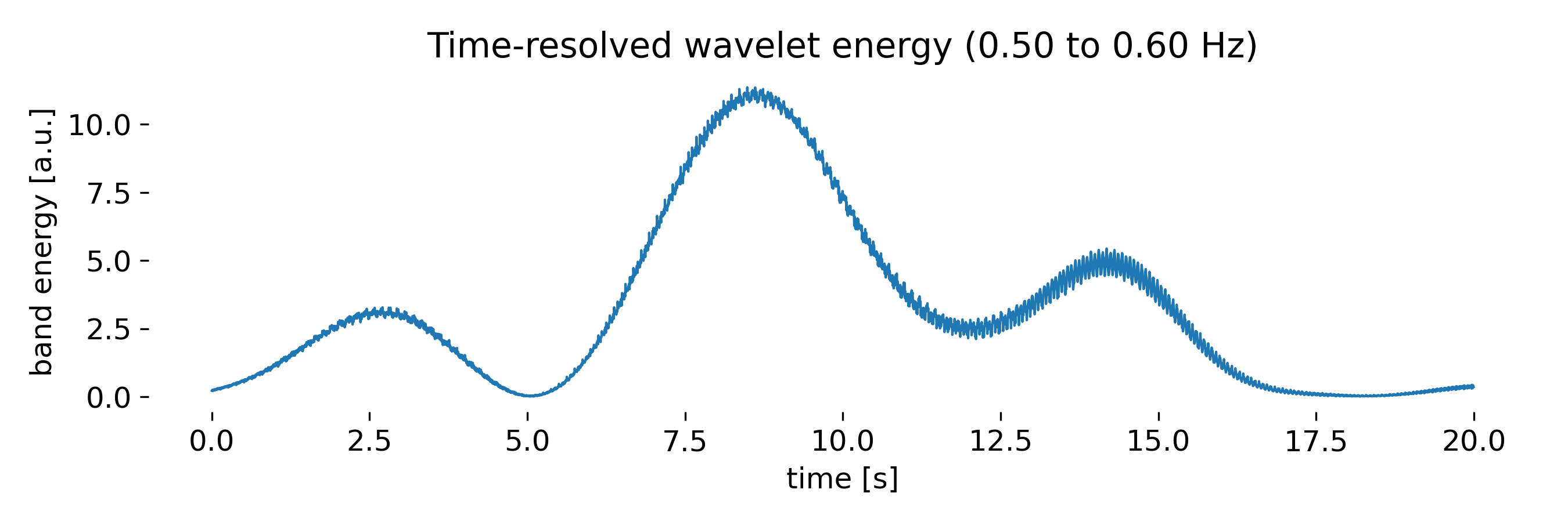 plt.title(f"Time-resolved wavelet energy ({band_lo:.2f} to {band_hi:.2f} Hz)")