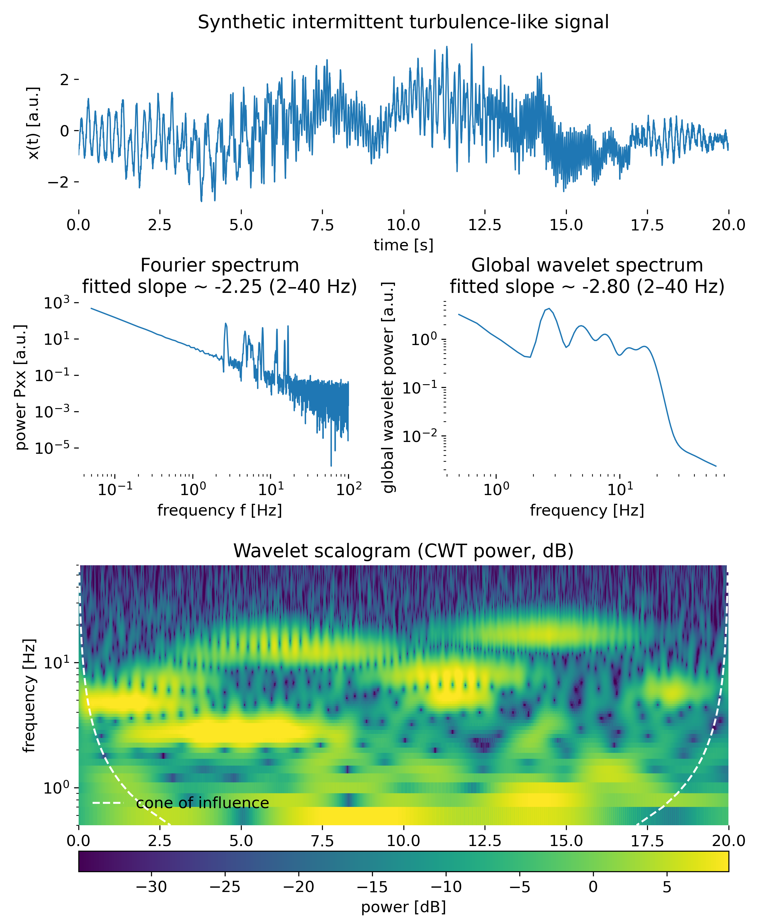 Overview of the wavelet analysis applied to a synthetic intermittent turbulence-like signal. The top panel shows the time series, illustrating strong nonstationarity and amplitude fluctuations. The middle panels compare the global Fourier power spectrum (left) and the global wavelet spectrum (right), both exhibiting approximate power-law behavior over an intermediate frequency range, but with different fitted slopes due to the distinct filtering properties of the two methods. The bottom panel shows the wavelet scalogram in logarithmic power units, revealing the temporal localization of energy across scales. The dashed curves indicate the cone of influence (COI), outside of which wavelet coefficients are affected by edge effects and should not be interpreted quantitatively.