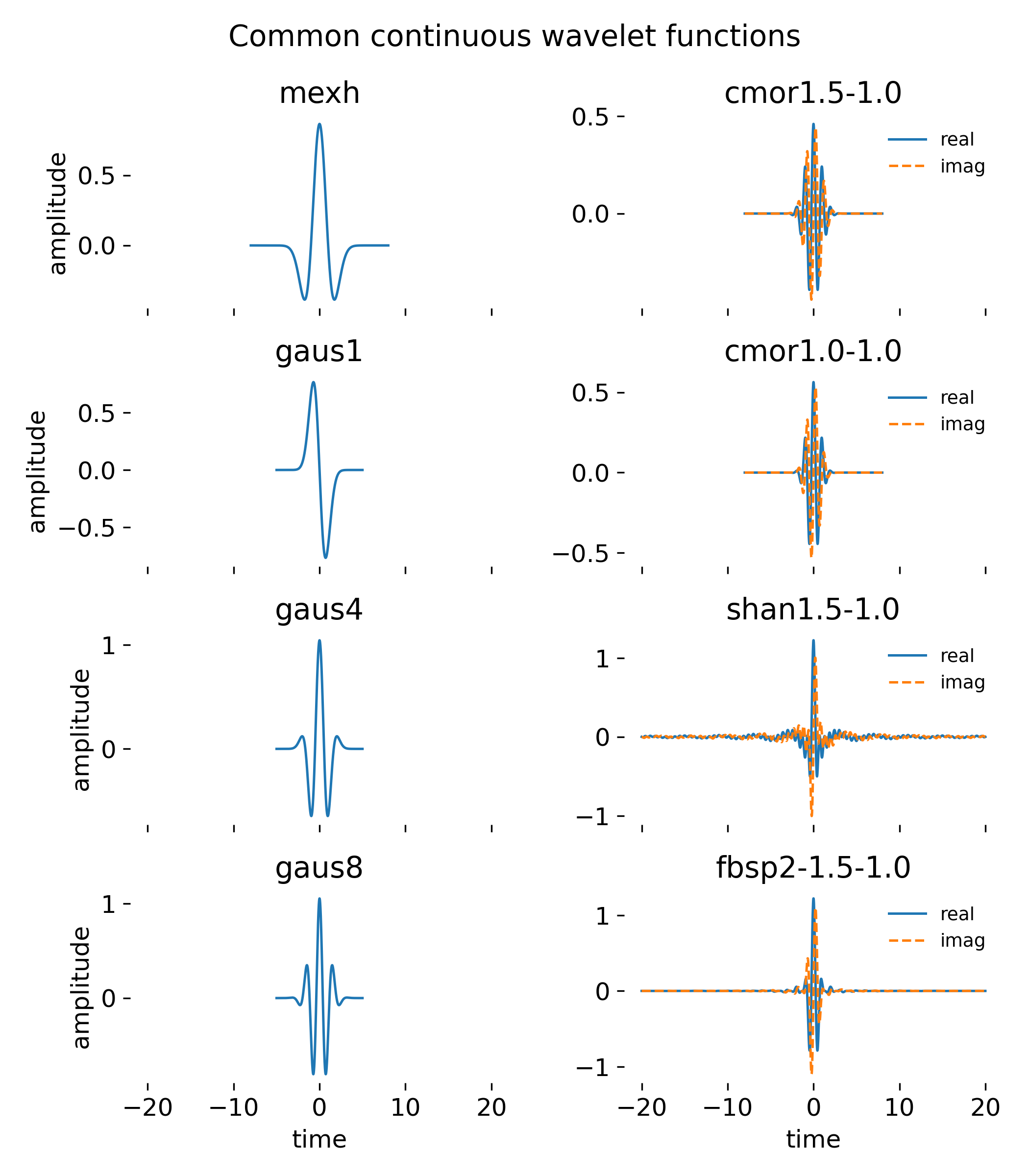 Examples of common continuous wavelet functions used in continuous wavelet analysis (CWT). The left column shows real-valued wavelets, including the Mexican hat and Gaussian wavelets of increasing order, which differ in smoothness and oscillatory structure. The right column shows complex-valued wavelets, such as Morlet, Shannon, and frequency B-spline wavelets, with real and imaginary parts plotted separately. These complex wavelets provide localized oscillatory kernels with well-defined amplitude and phase, making them particularly suitable for time–frequency analysis of nonstationary and turbulent signals. The Python script to generate this figure is available in the GitHub repository mentioned at the end of this post.