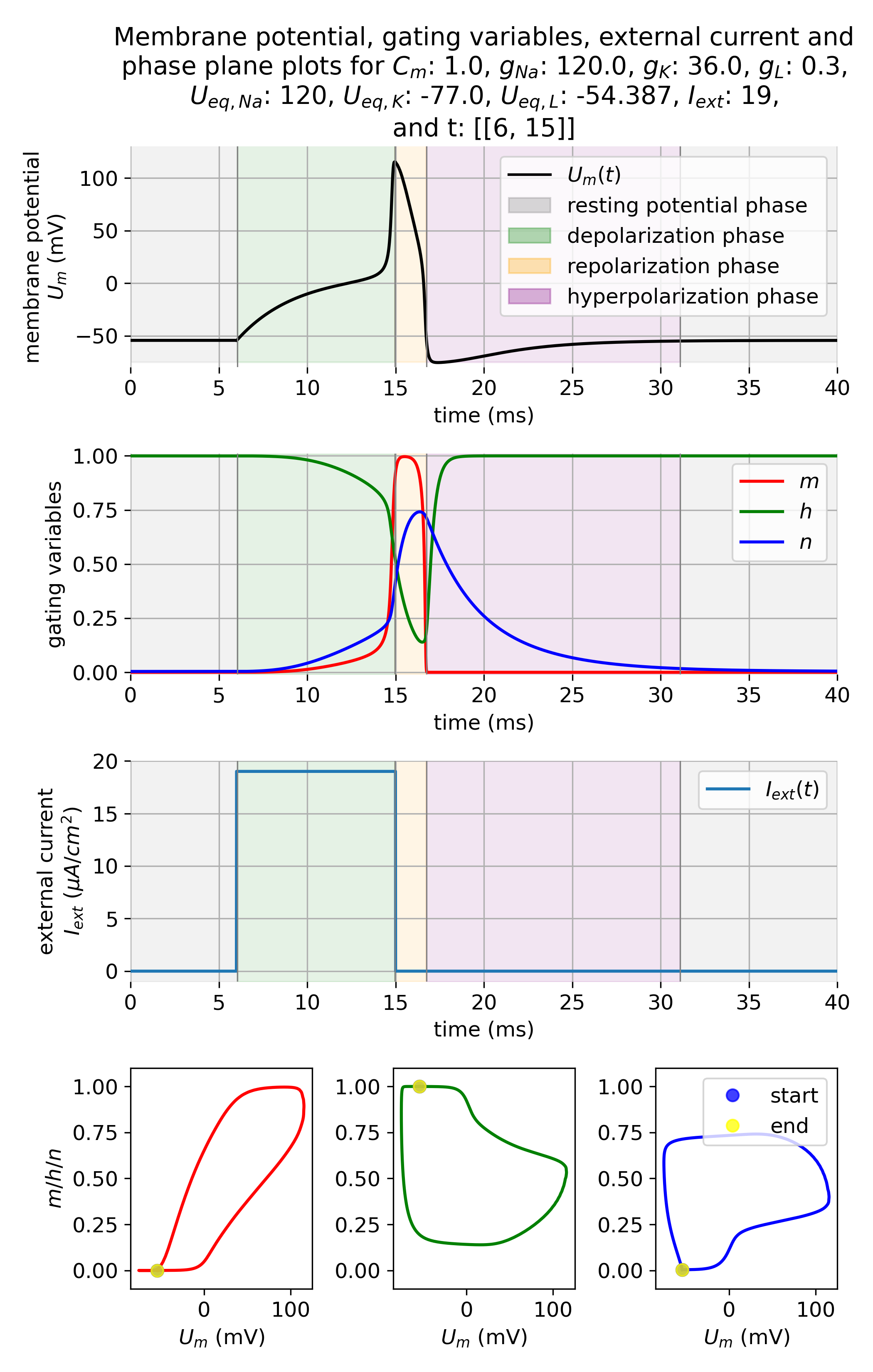 \[\begin{align} C \frac{dU_{m}}{dt} =& \; I_{ext}(t) \; - \notag \\ & - g_{Na} m^3 h (U_{m} - U_{eq,Na}) \notag \\ & - g_{K} n^4 (U_{m} - U_{eq,K}) \label{eq:hh1} \\ & - g_{L} (U_{m} - U_{eq,L}) \notag \\ \frac{dp}{dt} = & \; \alpha_{p}(U_{m}) (1 - p) - \beta_{p}(U_{m}) x, \label{eq:hh2} \end{align}\]with $\alpha_{p}(U_{m})$ and $\beta_{p}(U_{m})$ given by Equations ($\ref{eq:alpha}$) and ($\ref{eq:beta}$) and $p \in \lbrace m, h, n\rbrace$.