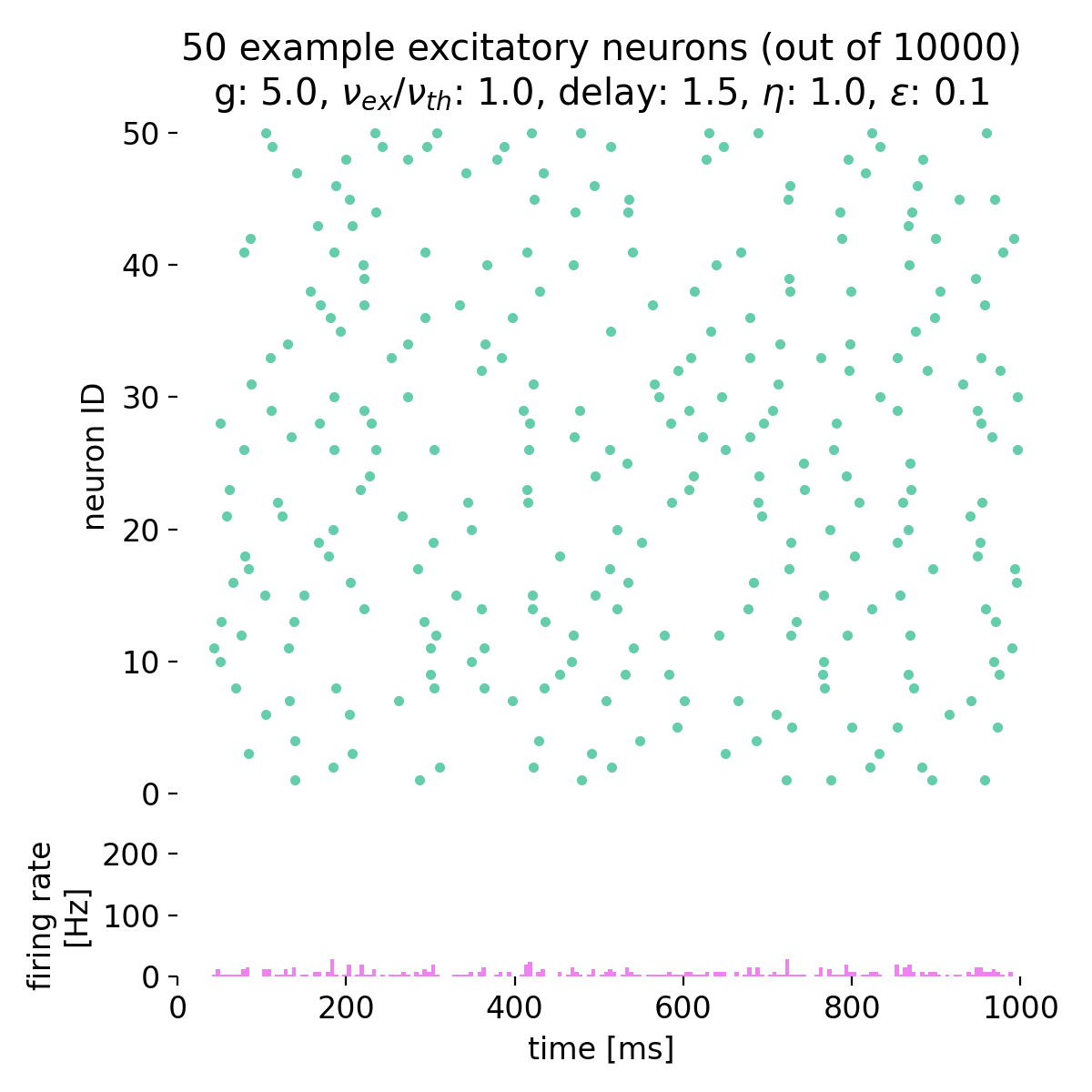 We will adapt and slightly modify the original code from the NEST tutorial “Random balanced network (alpha synapses) connected with NEST”ꜛ. To replicate the results from Figure 8 in Brunel (2000)ꜛ, we will simulate $N_{\text{ex}} = 10000$ excitatory neurons along with $N_{\text{in}} = 250$ inhibitory neurons. The synaptic delay $D$ and the synaptic time constant $\tau_{\text{syn}}$ are set to 1.5 ms and 0.5 ms, respectively. The connection probability $\epsilon$ is set to 0.1, and the number of connections, $C_E$ and $C_I$, is set to 1000 and 250, respectively. The synaptic weights $J$ is set to 0.1 mV, the membrane time constant $\tau_m$ is set to 20 ms, and the membrane capacitance $C_m$ is set to 250 pF. The membrane threshold potential $\theta$ is set to 20 mV. The simulation will run for 1000 ms with a resolution of 0.1 ms. We will run the simulation for various values of the synaptic weights ratio $g$ and the ratio $\eta$ of the external input rate $\nu_{\text{ext}}$ and the threshold rate $\nu_{\text{th}}$ to observe the different network states. Note that for visualization purposes, we record spike events from only 50 excitatory neurons (it is not necessary to track all 10,000 excitatory neurons).