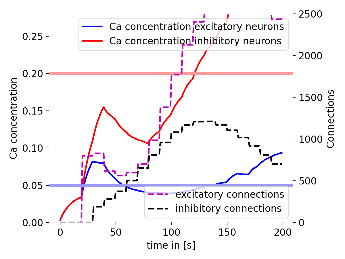 - Homeostatic plasticity: The calcium concentration approaching their respective target levels (horizontal lines) illustrate the homeostatic regulation of synaptic elements. This mechanism ensures that neurons maintain a stable level of activity over time.