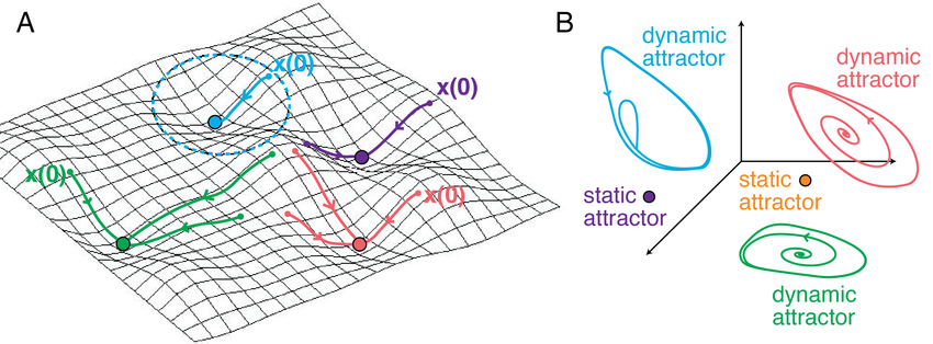 (A) In recurrent networks with symmetric interactions, such as Hopfield type networks, neural activity evolves toward stable fixed point attractors. Independent of initial conditions, trajectories converge into basins of attraction that correspond to stored or learned network states. The illustrated trajectories show how different initial states relax into distinct stable fixed points. (B) In networks with asymmetric connectivity, fixed point attractors can coexist with dynamic attractors, such as limit cycles or more complex recurrent trajectories. These dynamic attractors support sustained, time dependent activity patterns and illustrate how learning can give rise not only to static memory states but also to structured temporal dynamics. Source: Curto & Morrison, Graph rules for recurrent neural network dynamics: extended version, 2023, preprint, arXiv, doi: 10.48550/arXiv.2301.12638ꜛ, ResearchGateꜛ (license: CC BY-SA 4.0)