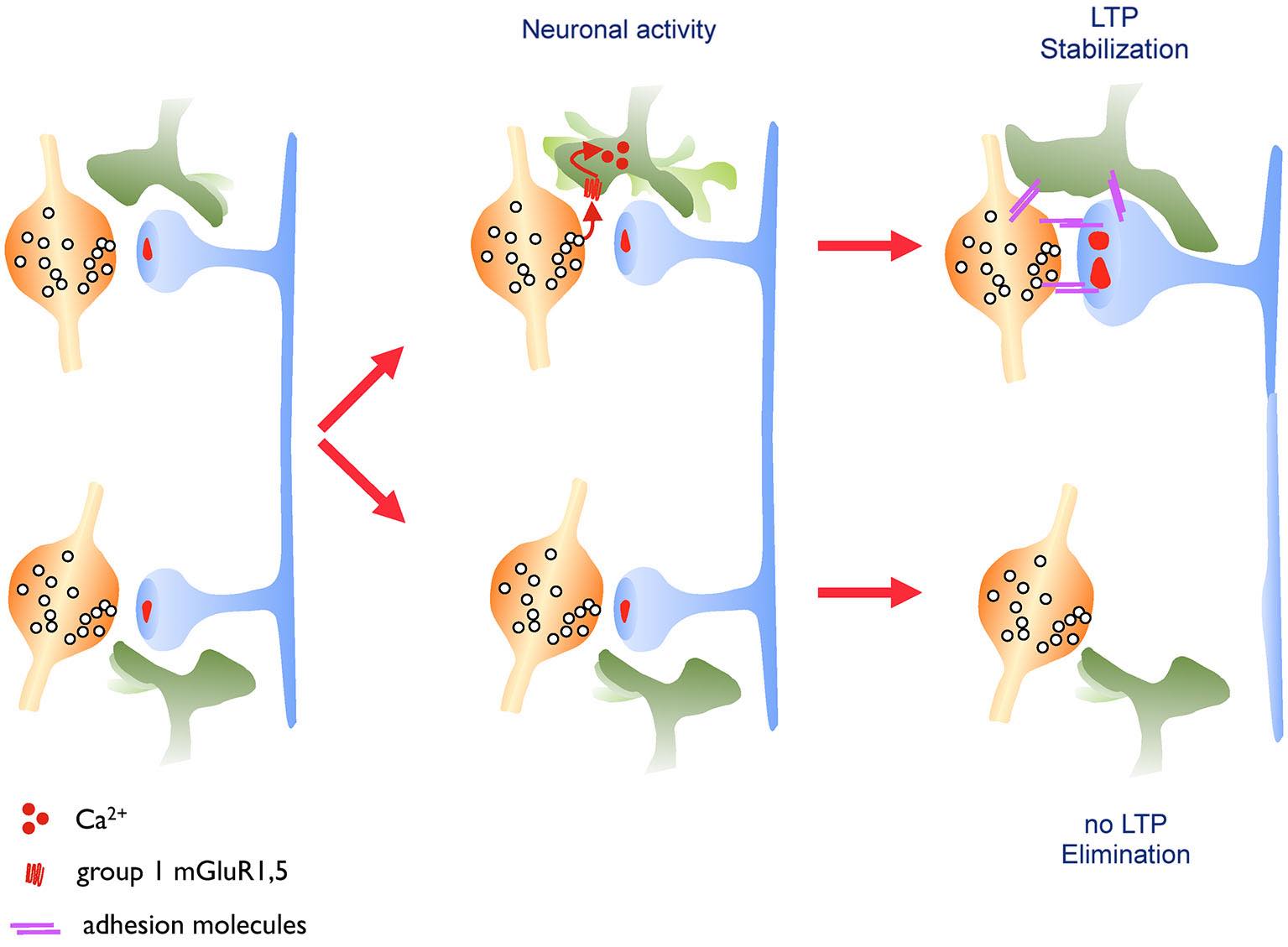 Sketch illustrating astrocytic structural plasticity and synapse stabilization. The sketch illustrates how activity dependent remodeling of astrocytic processes contributes to the long term maintenance of activated synapses. Left: Excitatory synapses are dynamically contacted by highly motile astrocytic processes, reflecting ongoing structural plasticity in the tripartite synapse. Middle: Neurotransmitter release during neuronal activity activates metabotropic glutamate receptors on astrocytic processes, leading to intracellular calcium signaling and increased motility of astrocytic extensions. Right: Under learning related conditions that induce long term potentiation (upper synapse), enhanced astrocytic motility results in increased and persistent coverage of the synapse, promoting its stabilization. In contrast, synapses that are not potentiated (lower synapse) fail to recruit stable astrocytic contacts and are preferentially eliminated. Adhesion molecules are thought to contribute to this stabilization process. Source: Bernardinelli, Y., Nikonenko, I., Muller, D., Structural plasticity: mechanisms and contribution to developmental psychiatric disorders, Frontiers in Neuroanatomy, 2014, 8:123, doi 10.3389/fnana.2014.00123ꜛ (license: CC BY 4.0).