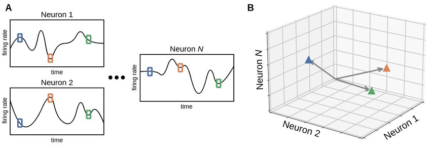 Neural state space representation of population activity. (A) The activity of individual neurons is shown as time dependent signals, for example firing rates or other measures of neural activation. Colored markers indicate the joint activity pattern across all recorded neurons at specific time points. (B) At each time point, the collective activity of a population of $N$ neurons defines a single point in an $N$ dimensional neural state space. As time evolves, neural dynamics correspond to trajectories through this space, providing a geometric description of population activity that underlies representation, computation, and learning. Source: Ji, X., Elmoznino, E., Deane, G., Constant, A., Dumas, G., Lajoie, G., Bengio, Y., Sources of richness and ineffability for phenomenally conscious states, 2023, preprint, arXiv, doi: 10.48550/arXiv.2302.06403ꜛ; Figure available via ResearchGateꜛ (license: CC BY-SA 4.0)