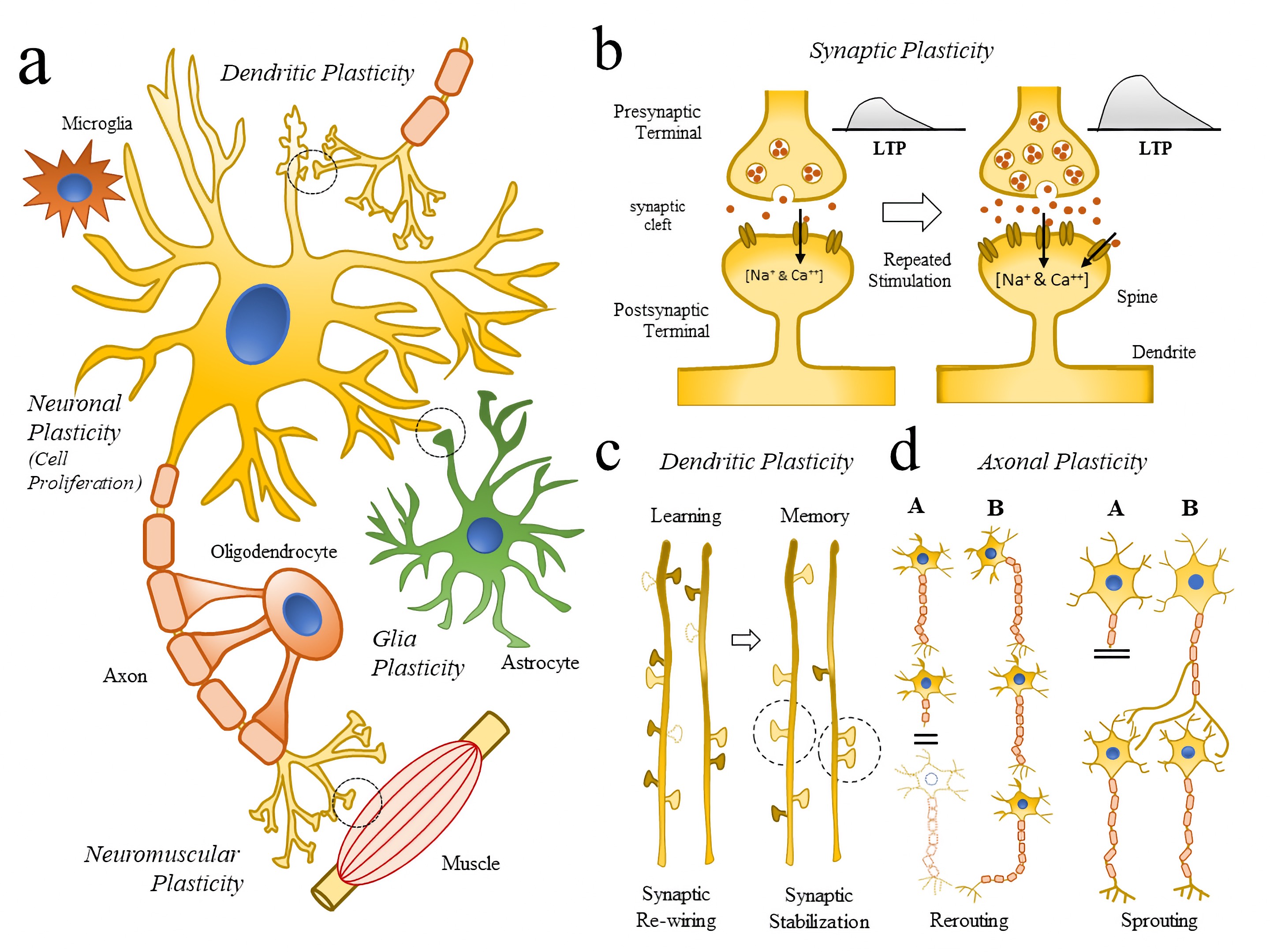 Schematic illustration of neuronal plasticity across scales. (a) Schematic representation of key cellular elements (neuronal and glial cells) involved in the neuroplasticity (NP) process (Neuronal and Glia plasticity) as well as subcellular compartments (Synaptic, Dendritic, Axonal, Neuromuscular Plasticity). (b) Schematic diagram representing how repetitive synaptic stimulations repetitive LTPs are linked to molecular changes (Doted circle in (a)), and the generation of dendrite and spine remodeling. (c) Schematic illustration showing some of the changes in dendrite formations (dotted dendrite spines) following learning (synaptic re-wiring) and memory formation (synaptic stabilization). (d) Schematic illustration showing axonal mechanism of neuroplasticity and repair (rerouting and sprouting) following brain injury. Abbreviations: LTP, long-term potential. Source: Wikimediaꜛ (license: CC BY-SA 4.0; original figure from Gatto, 2020ꜛ).