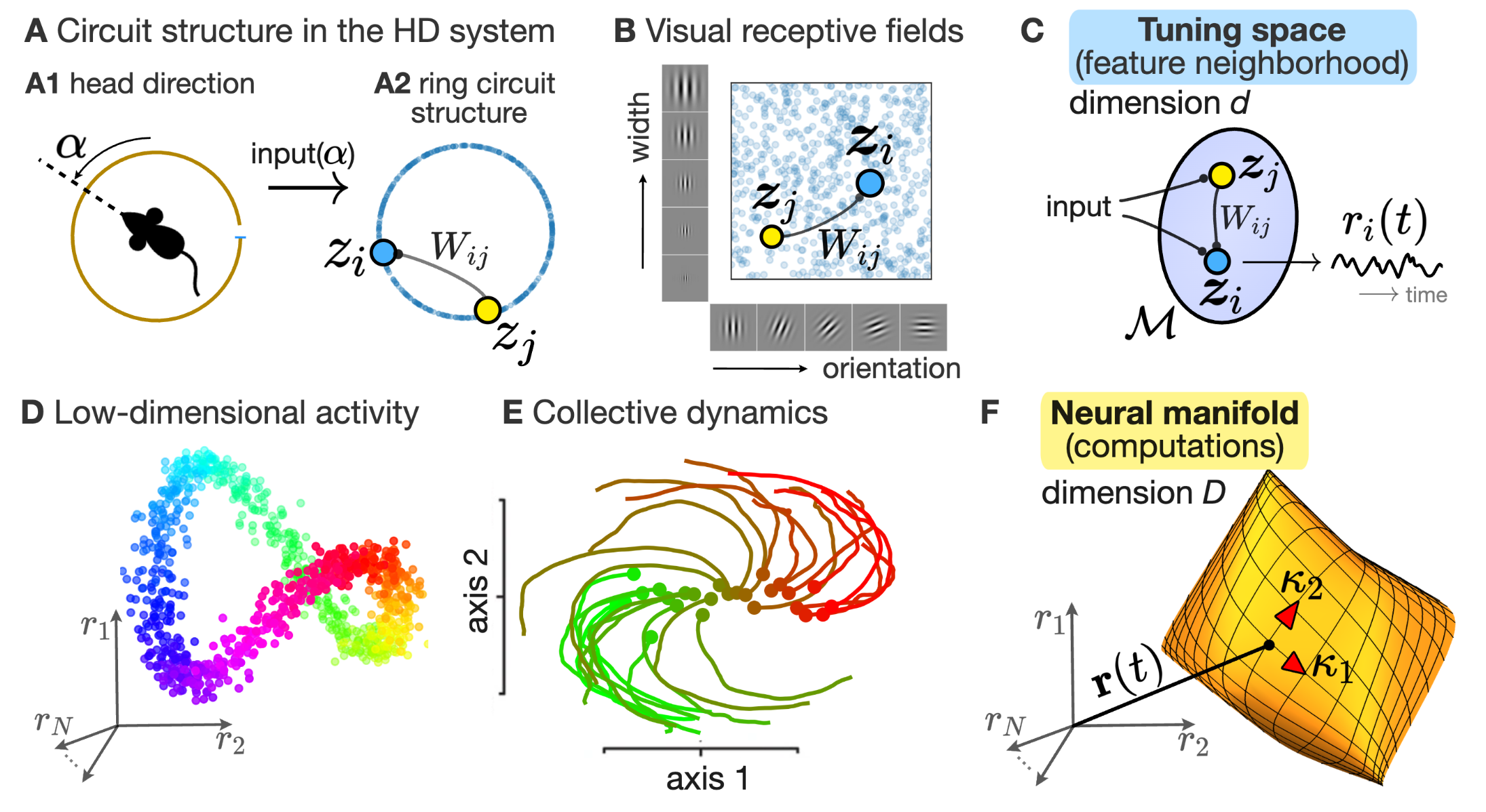 Two complementary perspectives on population activity in neural dynamics. The figure contrasts a “circuit” perspective with a “neural manifold” perspective. In circuit models, neurons are organized in an abstract tuning space, where proximity reflects tuning similarity, and recurrent connectivity $W_{ij}$ together with external inputs generates time-dependent firing rates $r_i(t)$ (panels A–C). In the neural manifold view, the joint activity vector $r(t)\in\mathbb{R}^N$ of a recorded population evolves along low-dimensional trajectories embedded in a high-dimensional space (panels D–F). This is illustrated by ring-like manifolds for head-direction representations and by rotational trajectories in motor cortex, both of which can often be captured by a small number of latent variables $\kappa_1(t),\ldots,\kappa_D(t)$ with $D\ll N$. In the context of our overview post here, I think, the figure highlights very well why neural dynamics naturally connects mechanistic network modeling with state-space descriptions of population activity. These are not competing accounts, but complementary levels of description that emphasize different aspects of the same underlying dynamical system. Source: Figure 1 from Pezon, Schmutz, Gerstner, Linking neural manifolds to circuit structure in recurrent networks, 2024, bioRxiv 2024.02.28.582565, doi: 10.1101/2024.02.28.582565ꜛ (license: CC-BY-NC-ND 4.0)