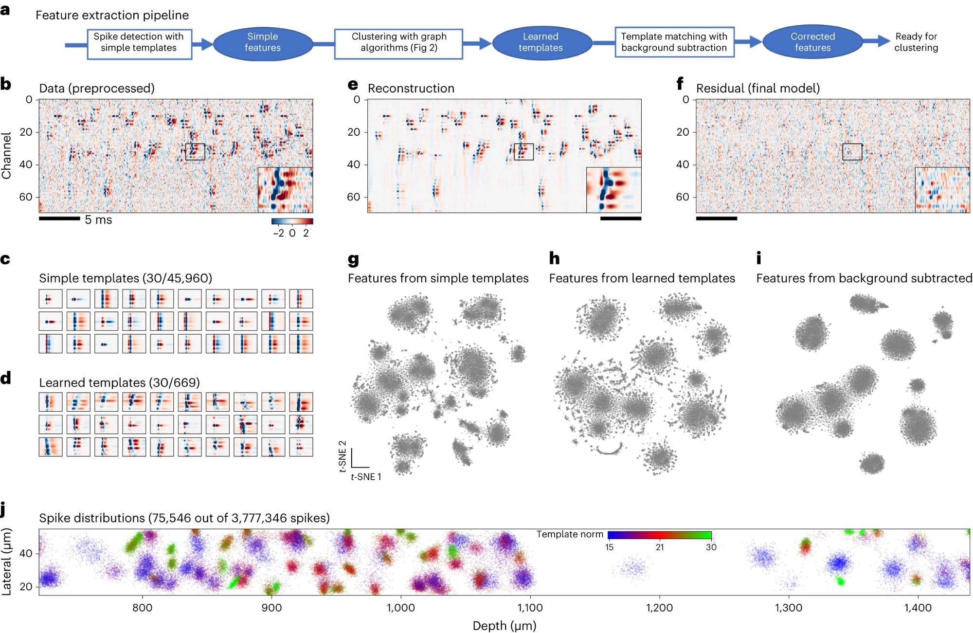 Figure 1 (panels a–j) from Marius Pachitariu et al. (2024)ꜛ illustrates the spike detection and feature extraction pipeline used in Kilosort4, exemplifying the analytical complexity introduced by large-scale neural recordings today. The figure shows how dense, high-channel-count recordings require multi-stage processing to separate overlapping spikes and extract meaningful features at scale. Panel a outlines the pipeline from initial spike detection using simple templates to refined, background-corrected features suitable for clustering. Panel b shows raw preprocessed Neuropixels data with frequent temporal and spatial spike overlap. Panels c and d compare predefined simple templates with learned templates adapted to the data. Panels e and f demonstrate signal reconstruction and residuals, highlighting structured activity beyond noise. Panels g–i visualize how feature representations improve with learned templates and background subtraction. Panel j shows the spatial distribution of extracted spikes along the probe. Together, the figure illustrates how advances in recording density necessitate increasingly sophisticated analysis methods. Source: Pachitariu et al., Spike sorting with Kilosort4, 2024, Nature Methods, 914–921, doi: 10.1038/s41592-024-02232-7ꜛ (license: CC BY 4.0)