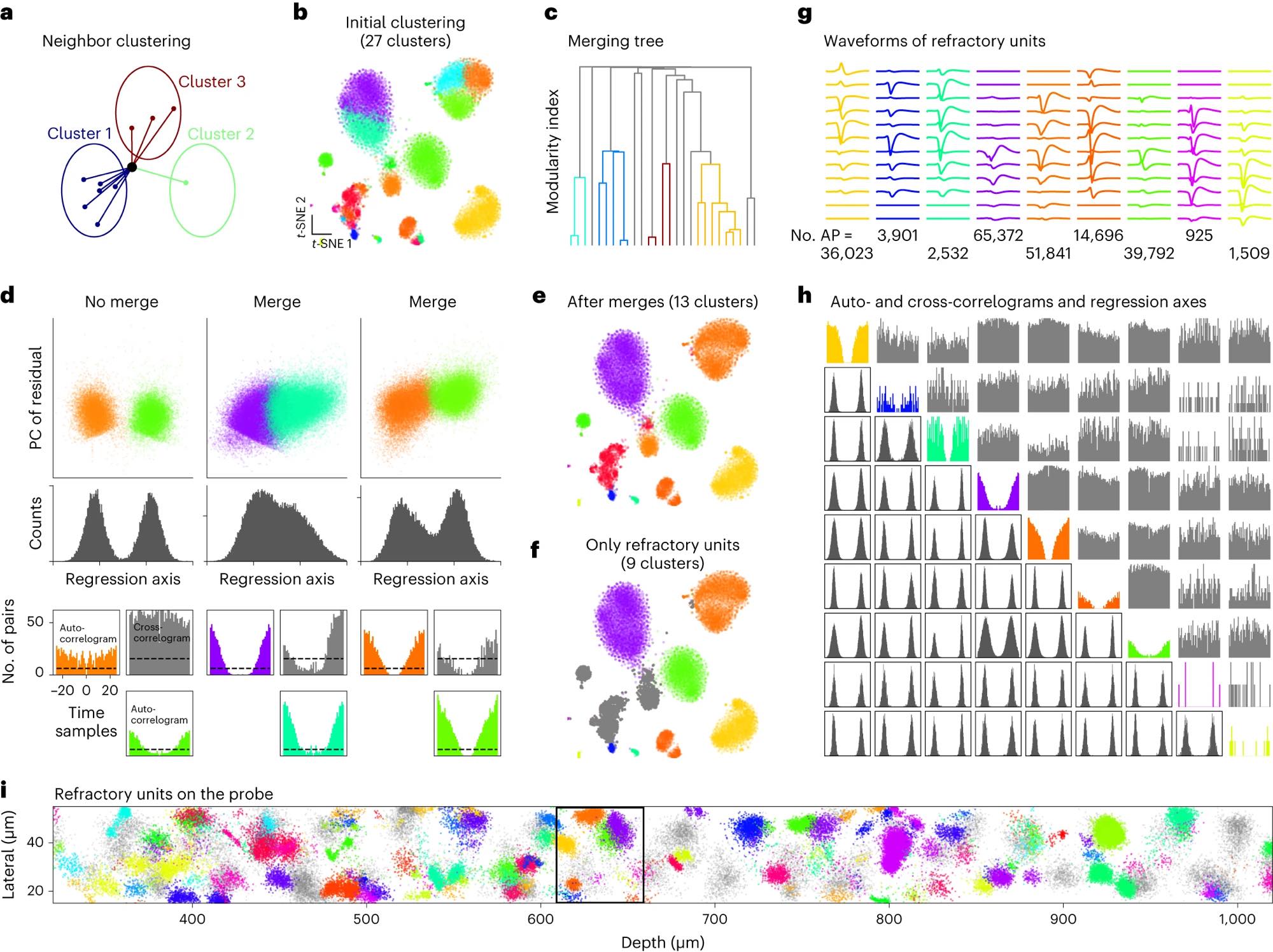 Figure 2 (panels a–i) from Marius Pachitariu et al. (2024) shows graph-based clustering strategies used in Kilosort4 to structure large-scale spike datasets. The figure illustrates how dense, high-dimensional spike features are iteratively reassigned and merged to obtain stable clusters from large neural populations. Panel a sketches the neighbor-based reassignment process that progressively reduces an initially large set of clusters. Panel b shows an example clustering overlaid on a t-SNE embedding of spike features. Panel c presents the hierarchical merging tree used to decide which clusters should be combined based on a modularity cost. Panel d summarizes the criteria for accepting or rejecting merges, combining feature-space bimodality with refractory-period constraints derived from spike timing. Panels e and f show the final clustering result, highlighting units that exhibit refractory periods. Panels g and h characterize the resulting units using average waveforms, autocorrelograms, cross-correlograms, and regression projections. Panel i visualizes the spatial distribution of clustered spikes along the probe. Together, the figure exemplifies how modern spike sorting algorithms impose structure on massive datasets by combining graph methods, statistical criteria, and biophysical constraints. Source: Pachitariu et al., Spike sorting with Kilosort4, 2024, Nature Methods, 914–921, doi: 10.1038/s41592-024-02232-7ꜛ (license: CC BY 4.0)