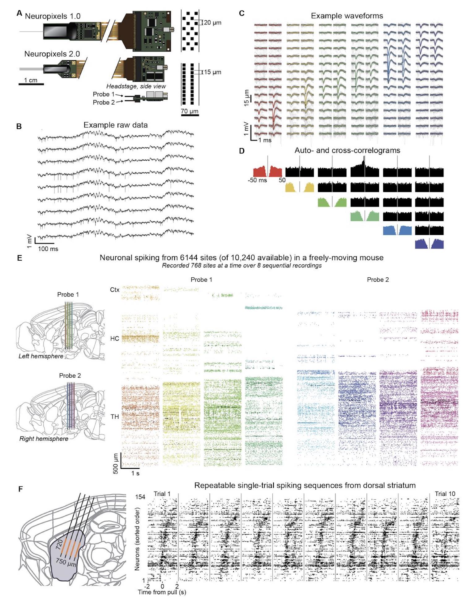 Neuropixels 2.0 enables dense, large-scale extracellular recordings. Shown is Figure 1 from Steinmetz et al. (2020)ꜛ showing how Neuropixels probes support population-level recordings with single-neuron resolution. The figure illustrates the miniaturized high-density probe architecture, example raw extracellular signals and spike waveforms, validation using auto- and cross-correlograms, and large-scale spiking activity recorded across thousands of sites spanning multiple brain regions. Source: Figure 1 from Steinmetz et al., Neuropixels 2.0: A miniaturized high-density probe for stable, long-term brain recordings, 2020, bioRxiv 2020.10.27.358291, doi: 10.1101/2020.10.27.358291ꜛ (license: CC BY 4.0)
