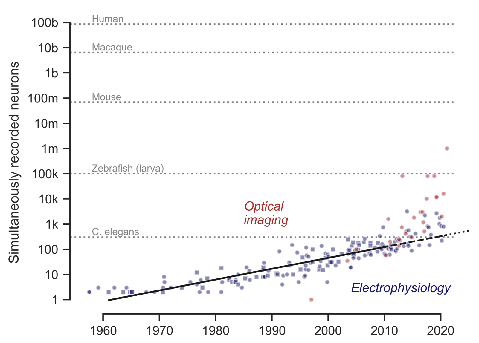 A more recent study by Anne E. Urai et al. (2021)ꜛ confirms and extends the pattern identified by Stevenson and Kording. Here is their Figure 2, summarizing the scaling of neural recording technologies across modalities and species from the 1950ies to the 2020ies. Blue points indicate the number of simultaneously recorded neurons using electrophysiological methods, including the original dataset analyzed by Stevenson & Kording (2011)ꜛ, shown as squares. Red points show population sizes achieved with optical imaging techniques such as two-photon and light-sheet microscopy. The solid line represents an exponential fit to the original electrophysiology data, while dashed and dotted black lines extrapolate this trend to the present and near future. Gray reference lines mark the approximate number of neurons in the brains of commonly studied model organisms. Not only are Stevenson and Kording’s observations upheld, but the trend also extends to optical methods, even further accelerating the growth in recorded neuron counts. Source: Anne E. Urai, Brent Doiron, Andrew M. Leifer, Anne K. Churchland, Large-scale neural recordings call for new insights to link brain and behavior, arXiv:2103.14662, doi: