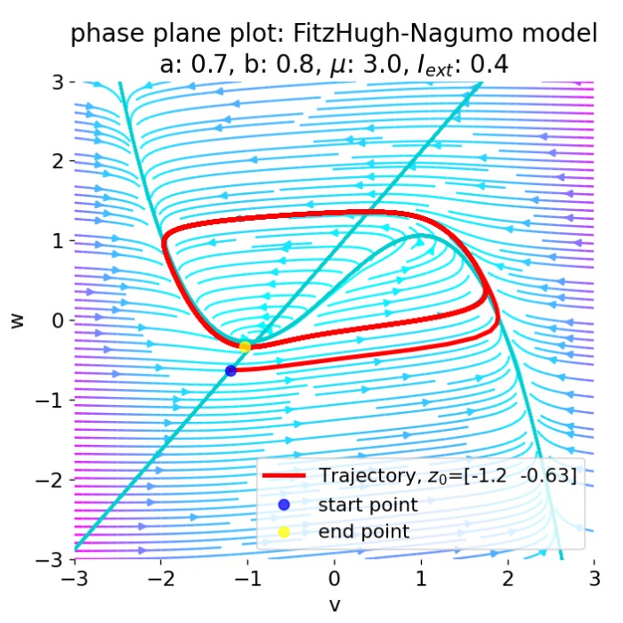 Figure 3 (panels A–H) from S. Komi et al. (2025)ꜛ demonstrates low-dimensional neural manifolds underlying locomotion and stopping. The figure illustrates how population activity in spinal motor circuits can be described by structured trajectories in a low-dimensional latent space. Panel A shows behavioral and neural data during walk-to-stop transitions, including pose metrics and phase-aligned spinal spike rasters. Panel B quantifies dimensionality reduction, showing that the first three principal components explain more than 80% of the variance in population firing rates, indicating strong low-dimensional structure. Panels C–E depict state-space trajectories during locomotion, forming a ring-shaped “locomotor manifold” with phase-dependent dynamics and a consistent flow direction, corresponding to a limit-cycle attractor. Persistent homology analysis confirms the ring topology. Panels F–H show that stopping behavior corresponds to a transition into a distinct postural manifold characterized by fixed-point attractor dynamics. Overall, this examples shows how large-scale neural recordings can be reduced to interpretable latent dynamics that link population activity to behavior. Such manifold-based interpretations of neural activity are a direct response to the challenges of scaling and have become a central framework in modern computational neuroscience. Source: Figure 3 from S. Komi, J. Kaur, A. Winther, M. C. Adamsson Bonfils, G. A. Houser, R. J. F. Sørensen, G. Li, K. Sobriel, R. W. Berg, Neural manifolds that orchestrate walking and stopping, 2025, Vol. n/a, Issue n/a, pages n/a, doi: 10.1101/2025.11.08.687367ꜛ (license: CC BY 4.0)