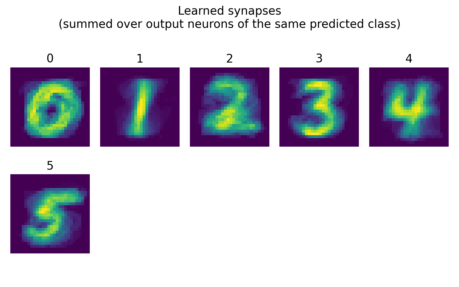 In this post, we closely followed nervos’ official MNIST tutorialꜛ and extended it with additional analyses of internal dynamics. Using a two layer network with 784 input neurons and 80 output neurons, and using only local STDP weight updates, the model reached an accuracy of roughly 85% on a six class test set. The learned synapse visualizations and the class specific weight templates indicated that the network develops digit like weight patterns, consistent with the idea that the output population self organizes into feature selective units.