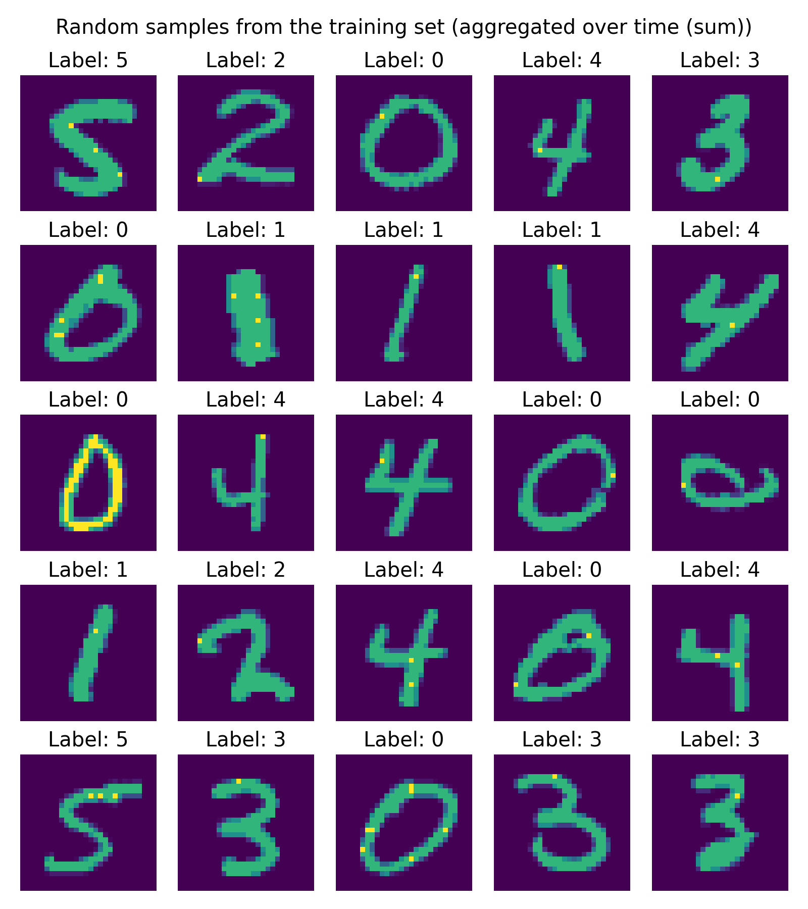 \[M \in \{0,1\}^{784 \times T},\]where $M_{ij} = 1$ if neuron $i$ fired at time step $j$.