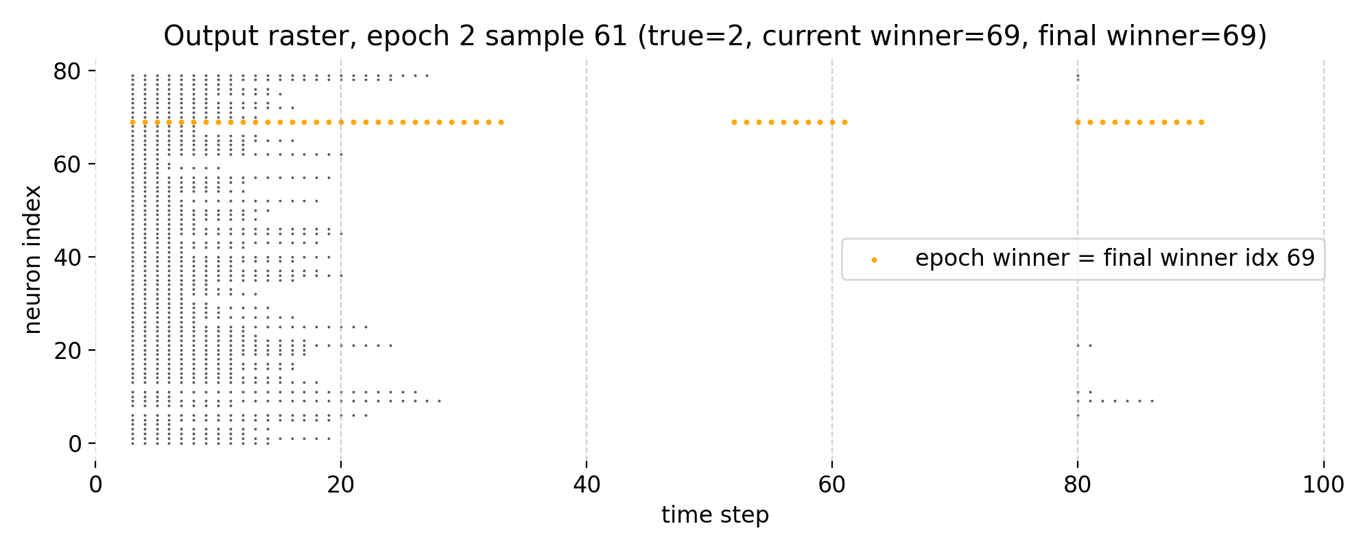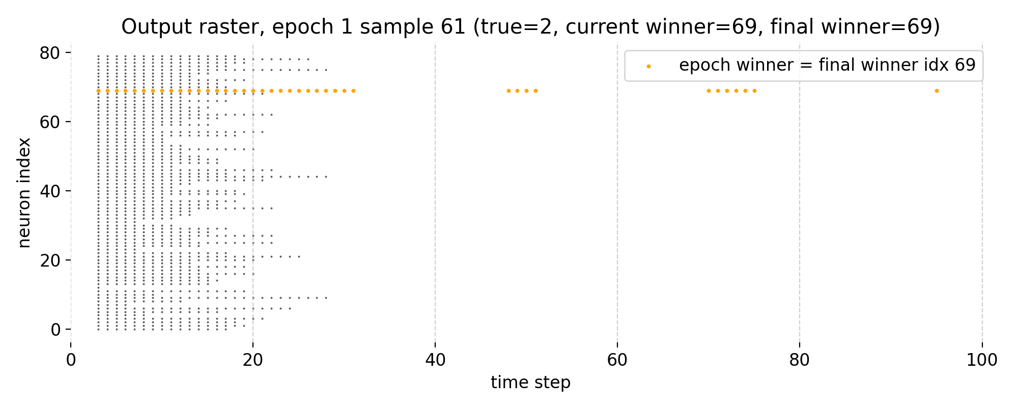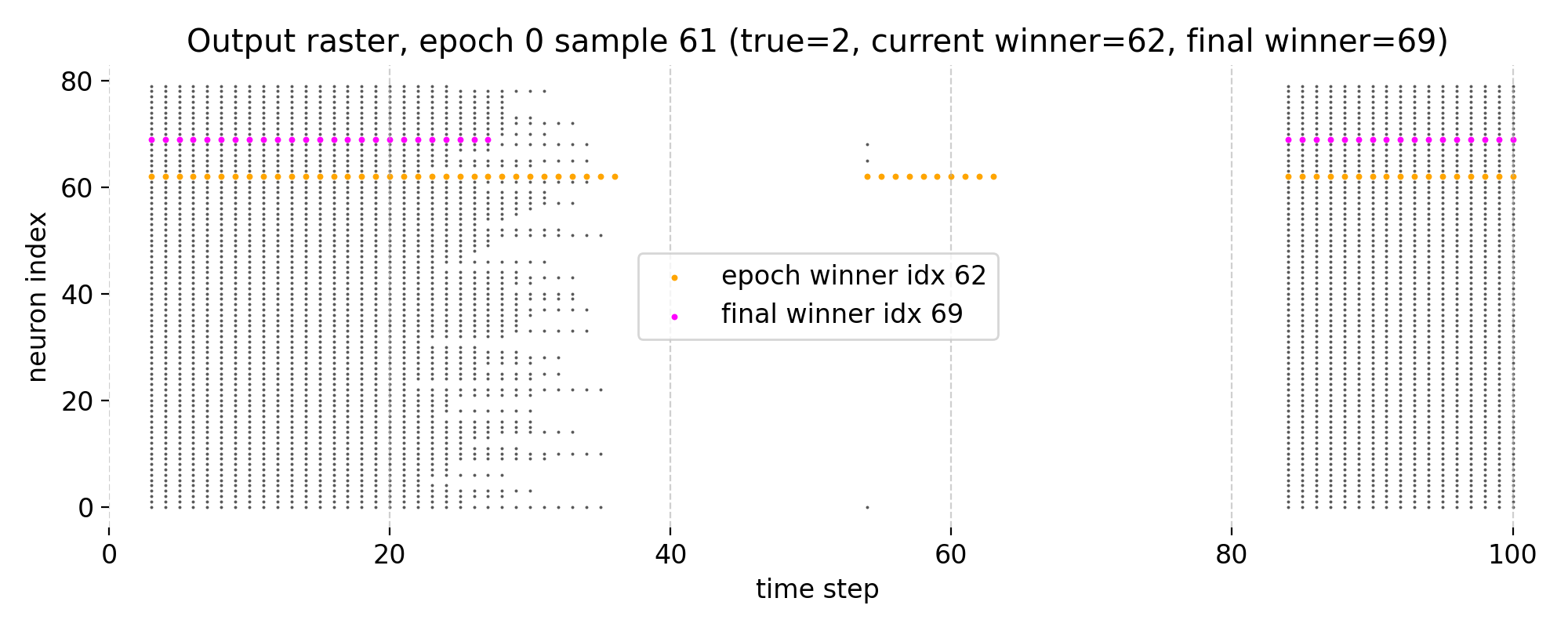 In epoch 1, the winner neuron changes from index 62 to index 69, which is the index of the final winner neuron at the end of the training. Thus, the final neuron already dominates the spike activity during this training sample, reflecting a stabilization of the network’s internal representation for this sample.