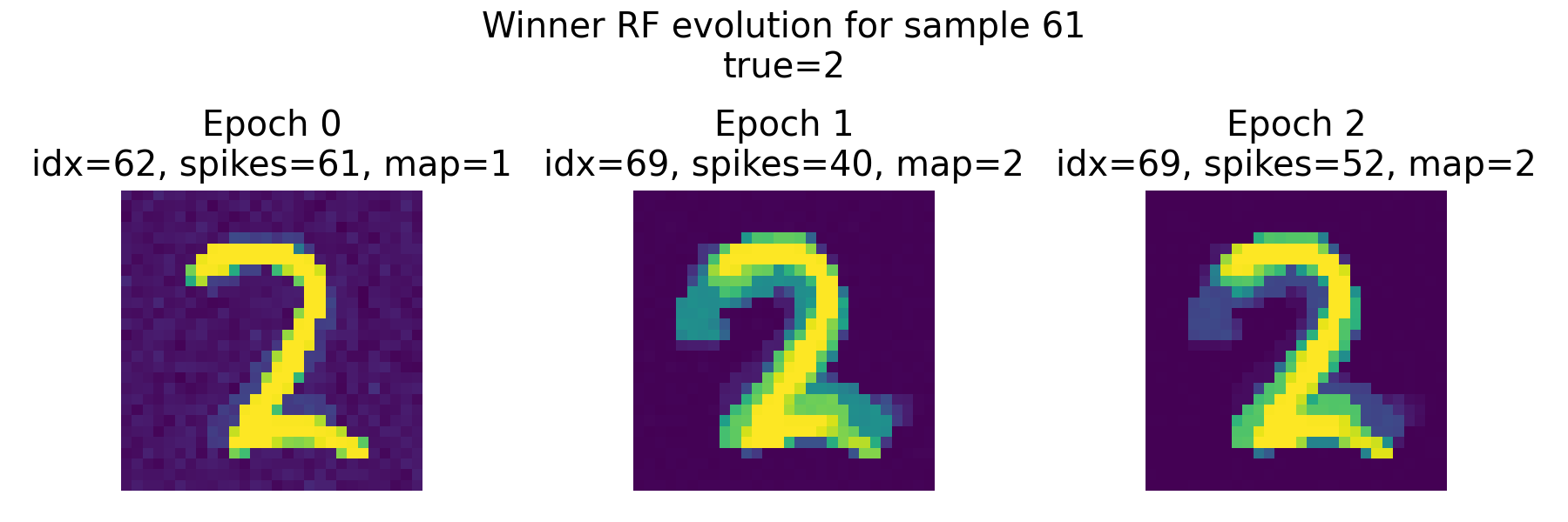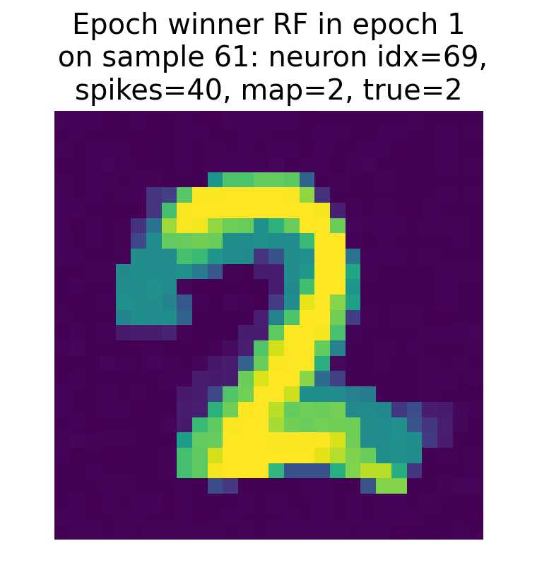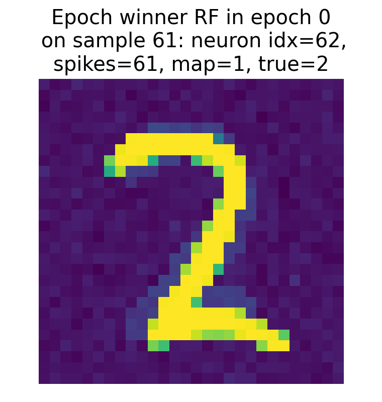 The RF of the final winner neuron as of epoch 0 also shows a similar pattern, but it is important to note that the final winner neuron can change across epochs, and its RF will evolve during training as the synaptic weights are updated based on the STDP learning rule. However, already in this first epoch 0, it maps to the correct label “2”, which suggests that it has already started to learn the correct association, even though its RF is not yet fully developed.