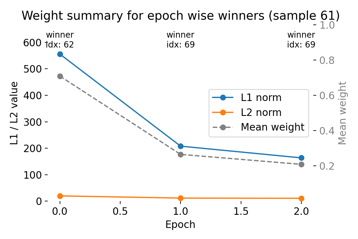Crucially, because the winner neuron can change across epochs, the summary metrics track the weights of different neurons at different times. This is intentional: the plot characterizes the weight profile of whichever neuron currently dominates the representation of this sample (compare the raster plots above), rather than following a single fixed neuron.