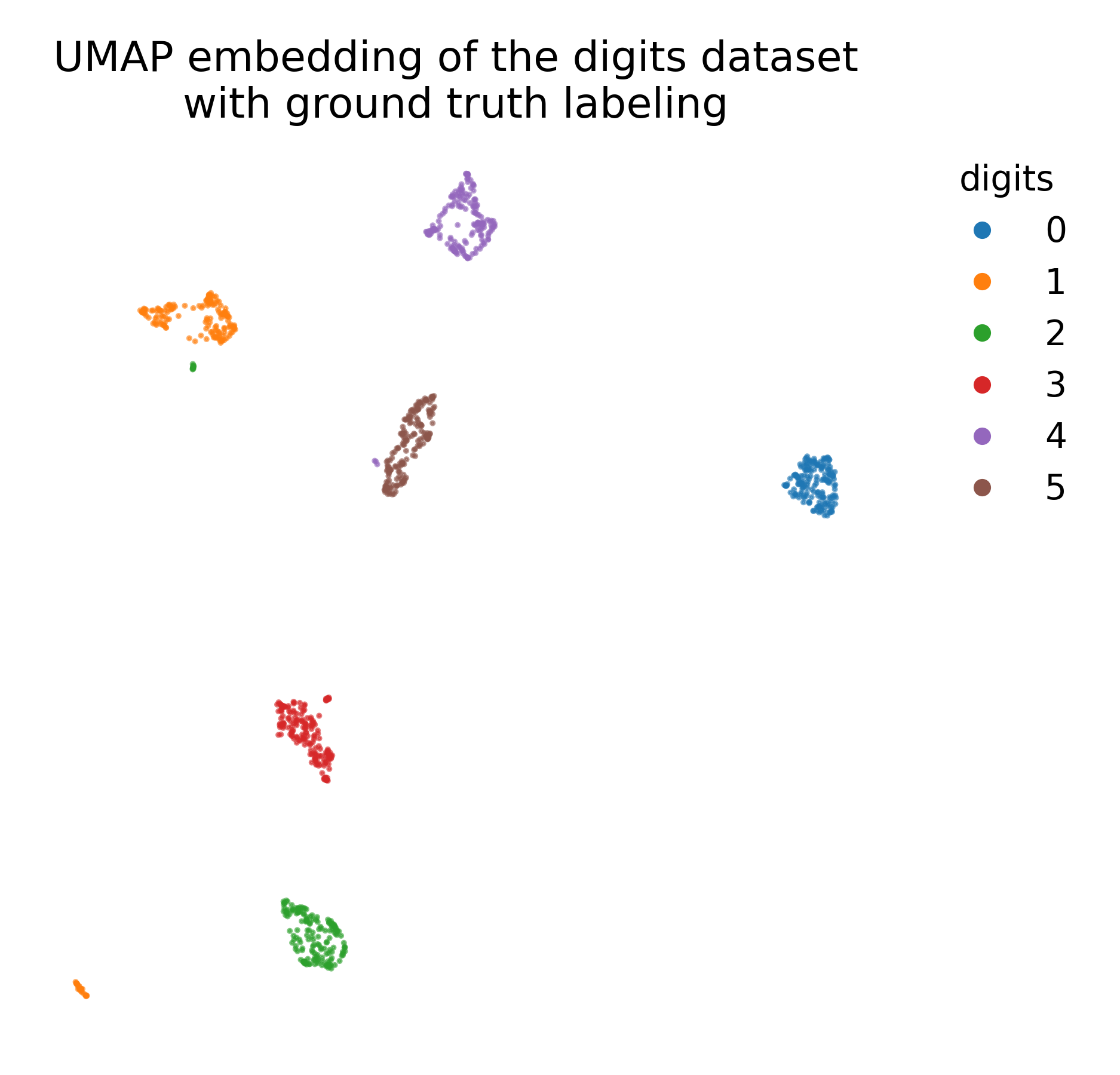 UMAP embedding of the digits dataset with ground truth labeling.