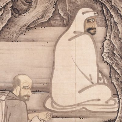 Left: Joganden moon (Joganden no tsuki), from One Hundred Aspects of the Moon, 1885. Minamoto no Tsunemoto kills a sika deer that sneaks into the court with his yumi. Source: Wikimedia Commonsꜛ (license: public domain). – Right: Hidetsugu in exile, from One Hundred Aspects of the Moon, 1885. Toyotomi Hidetsugu was imprisoned by Toyotomi Hideyoshi in Mount Kōya. Source: Wikimedia Commonsꜛ (license: public domain).