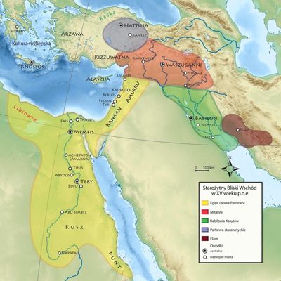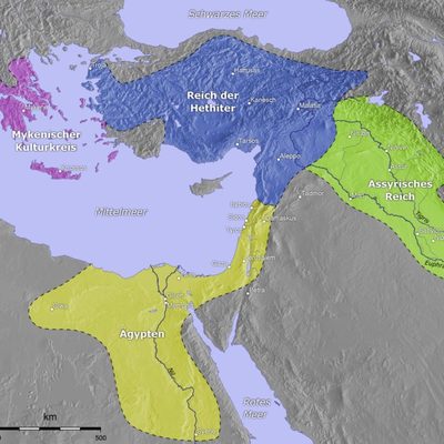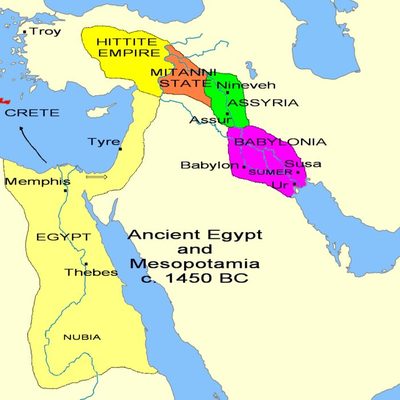 Map of ancient Egypt and Mesopotamia around 1450 BCE, showing the territories of the core civilizations at that time: Assyria with its two major cities Assur and Nineveh wedged between Babylonia downstream, the states of Mitanni and Hatti are upstream; Egypt with the major cities Thebes and Memphis, and the Hittite Empire in Anatolia. Source: Wikimedia Commonsꜛ (license: public domain)