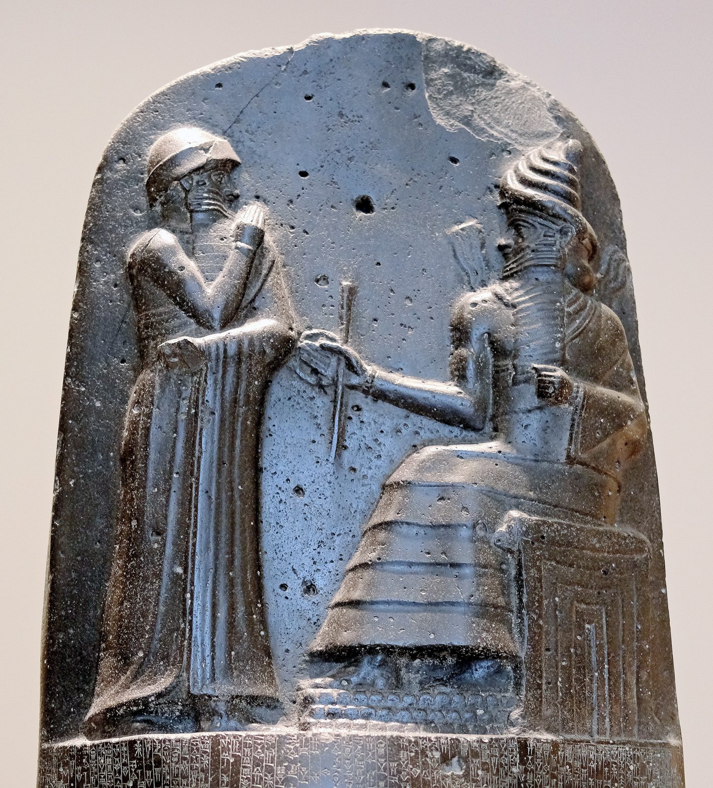 Hammurabi (standing) receiving his royal insignia from Shamash (god of justice) or possibly Marduk (god of order), detail of the stele of Hammurabi. Source: Wikimedia Commonsꜛ (license: CC BY-SA 3.0)
