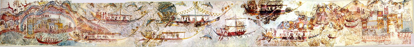 Ship Procession Fresco. Fresco of a ship procession from bronze age excavation at Akrotiri, on the greece island Santorini. Source: Wikimedia Commonsꜛ (license: public domain)