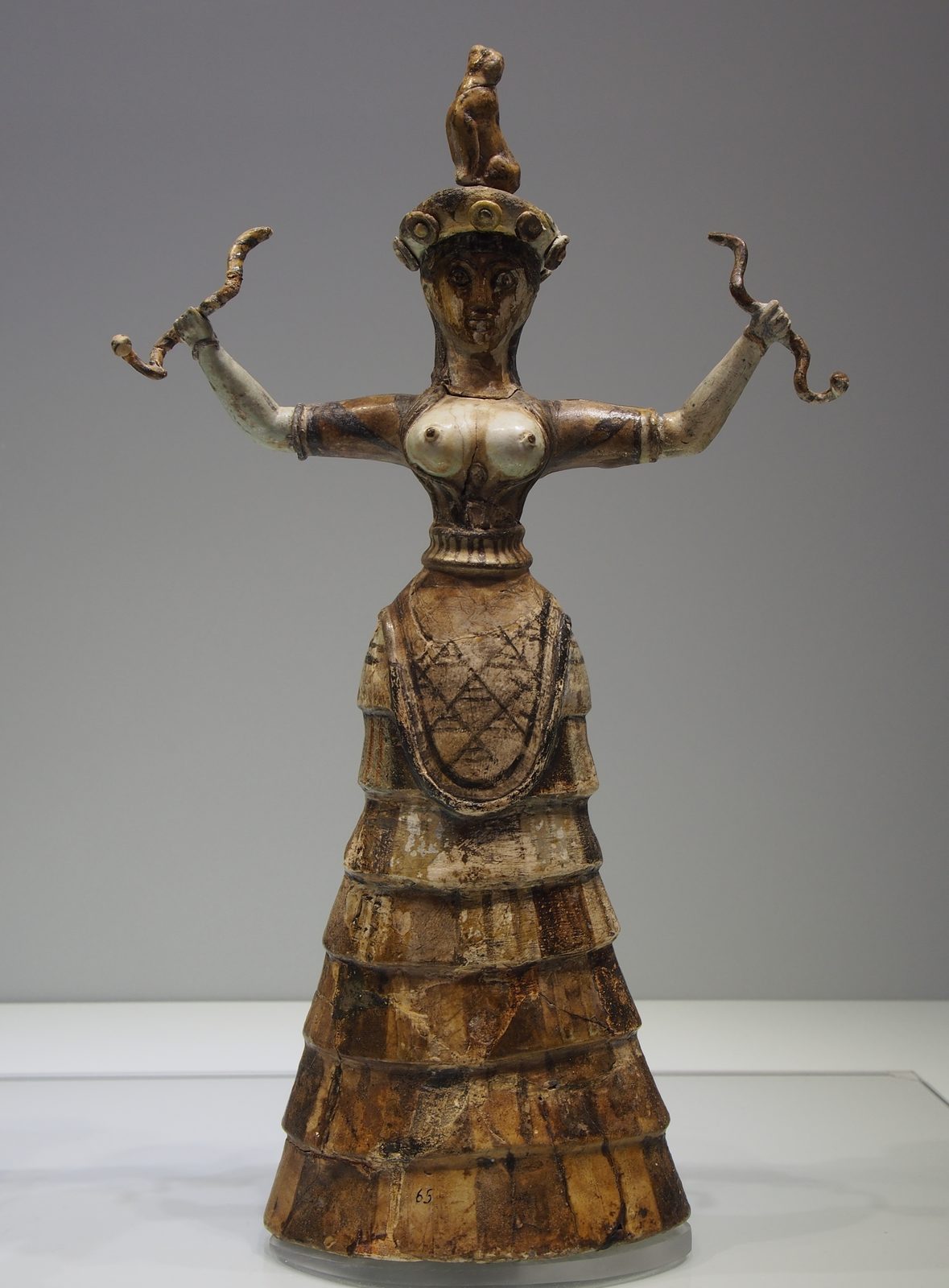 The smaller of two Minoan snake goddess figurines. Source: Wikimedia Commonsꜛ (license: CC BY-SA 4.0)